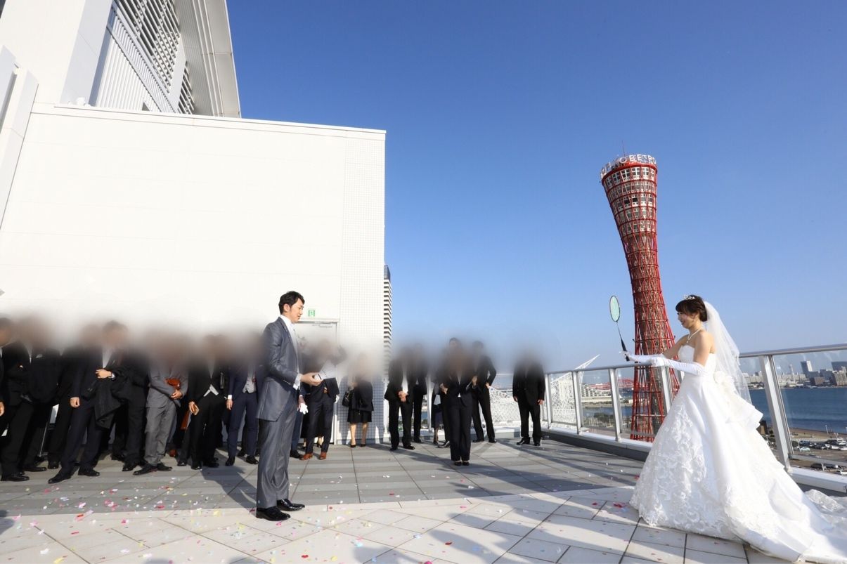 チャペルから出てフラワーシャワーを行うスカイコートでは、神戸らしい景色(ポートタワーとモザイクの観覧車)が目の前にあり、ドアが開いた瞬間、神戸を独り占めした気分になり、涙が出そうになる程感動するロケーションです。