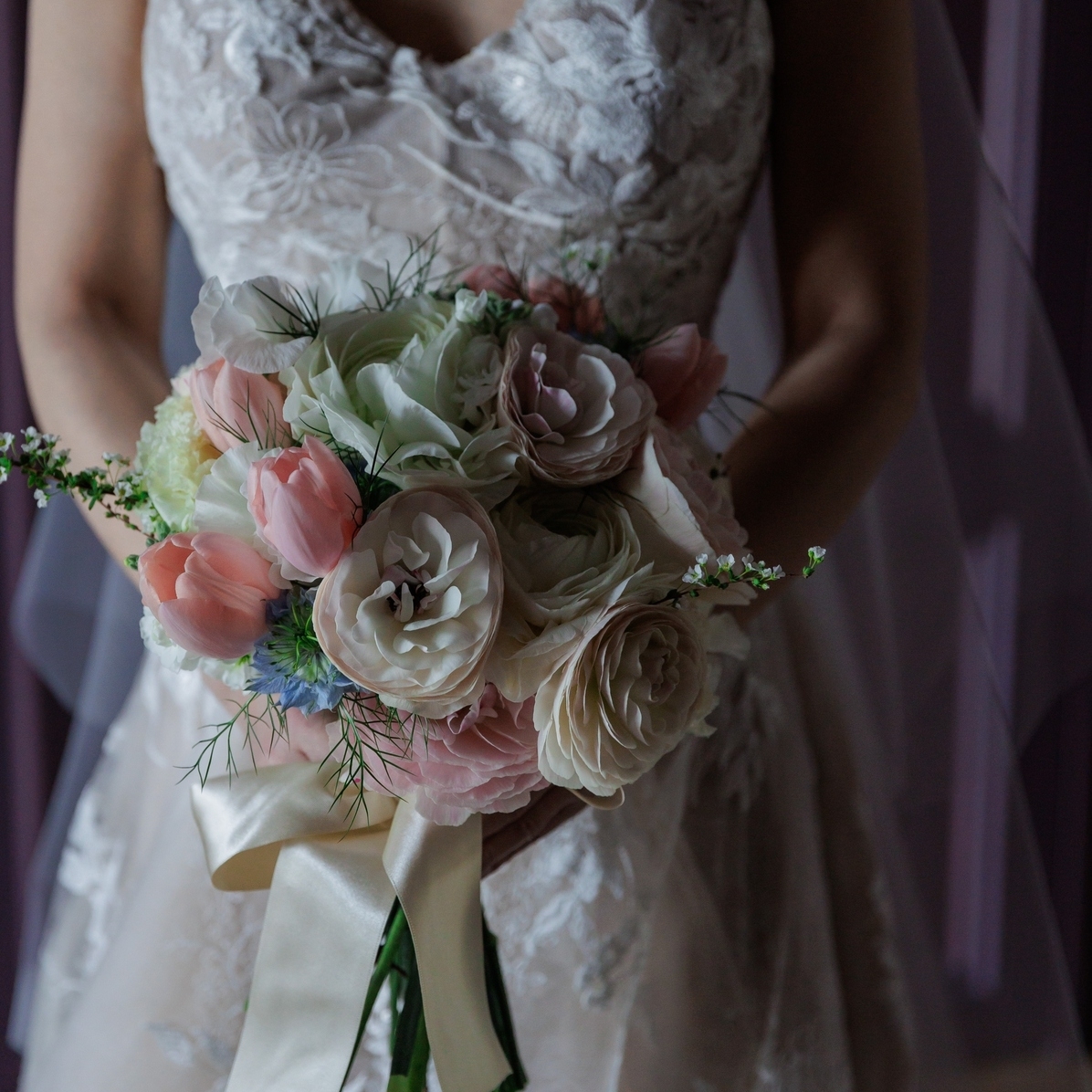 披露宴会場が白基調のため、パステル系の色味でピンクと水色をプラスいたしました。