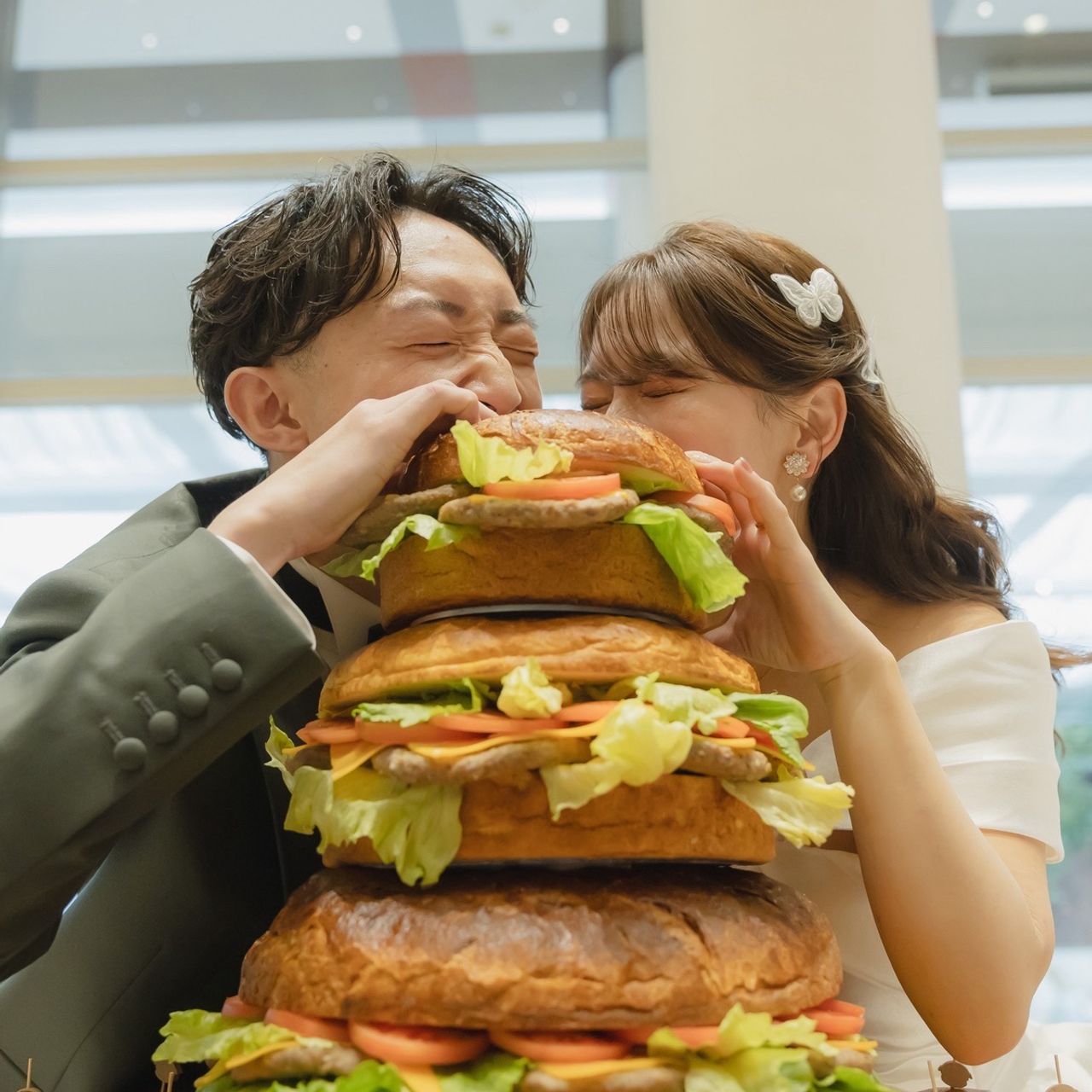 ウェディングケーキの代わりに、巨大ハンバーガーにしました。休みの日はほぼハンバーガーを食べに行くくらい、二人ともハンバーガーが好きだからです。みんなの反応もよく、ハンバーガーにしてよかったです!