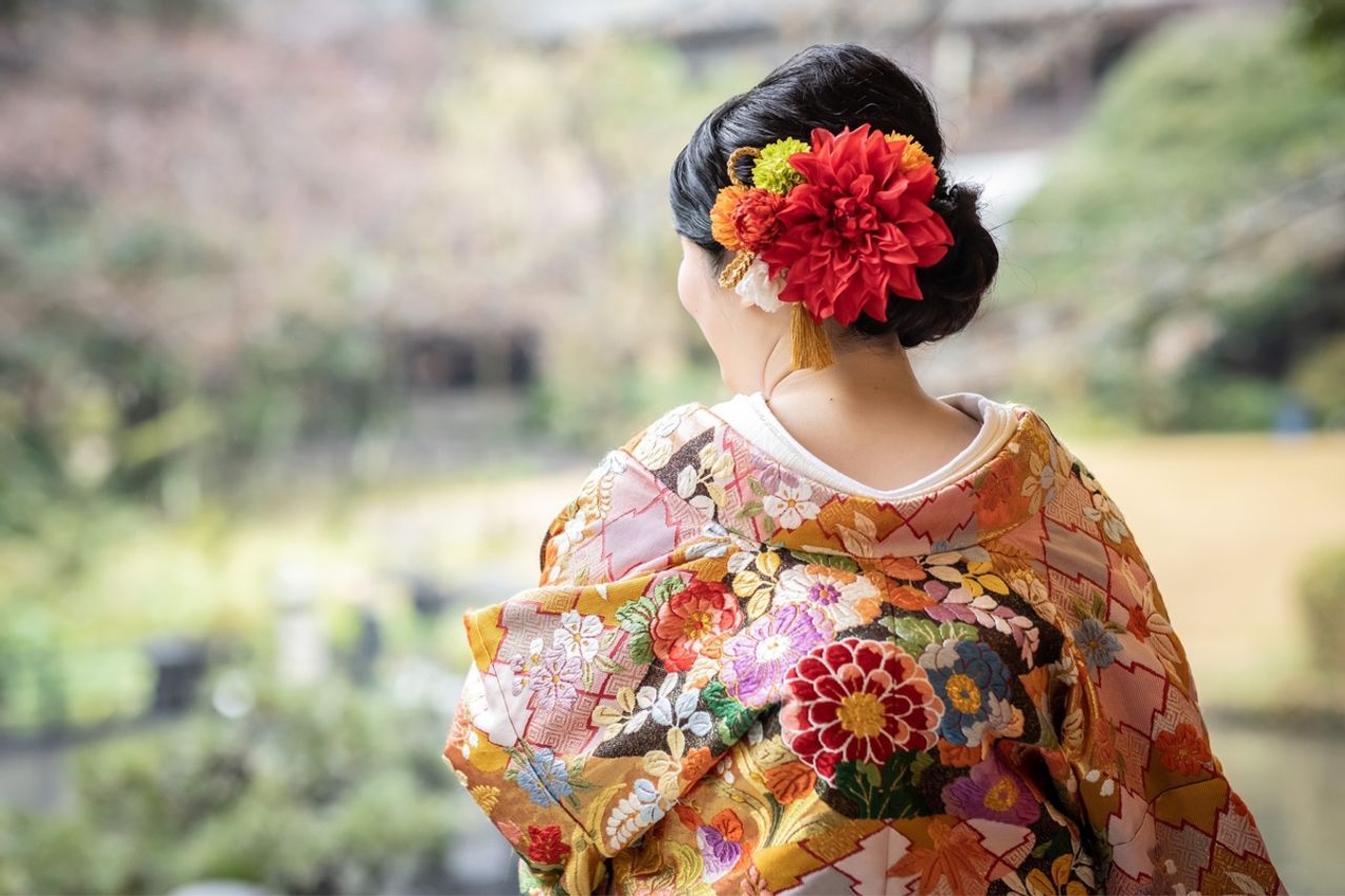 こばやしさんは浮月楼に隣接しているだけあって和装の種類が豊富で、特に色打掛は沢山種類があってとても迷いました。私が選んだ色打掛は、色が鮮やかで柄は様々なお花が刺繍されていて、とても豪華で可愛らしいところが気に入っています。