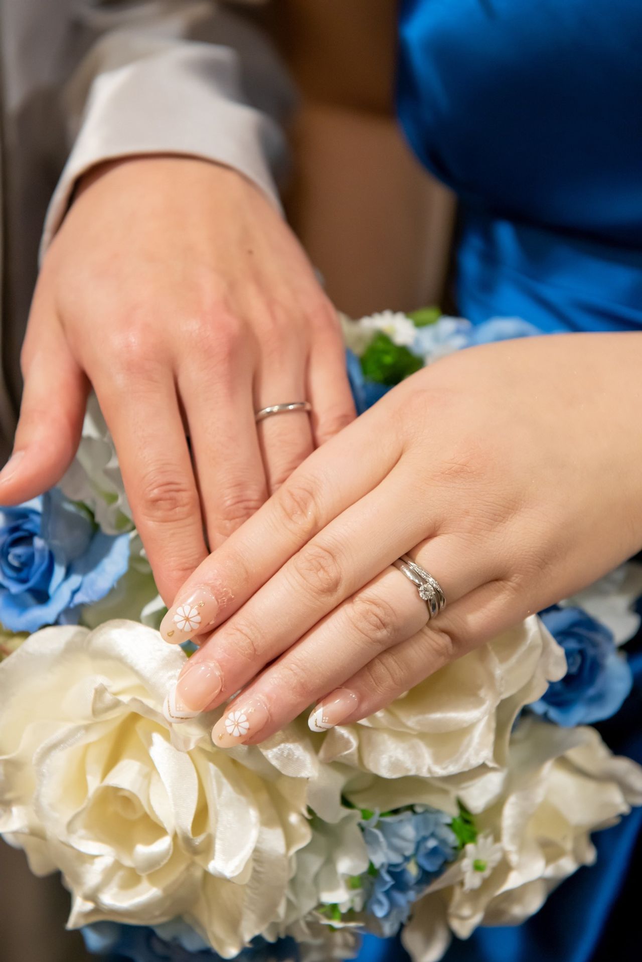 ネイルチップにしました。白無垢、色打掛、ドレスの全てに合うように淡いピンク色の花柄のネイルチップを選びました。