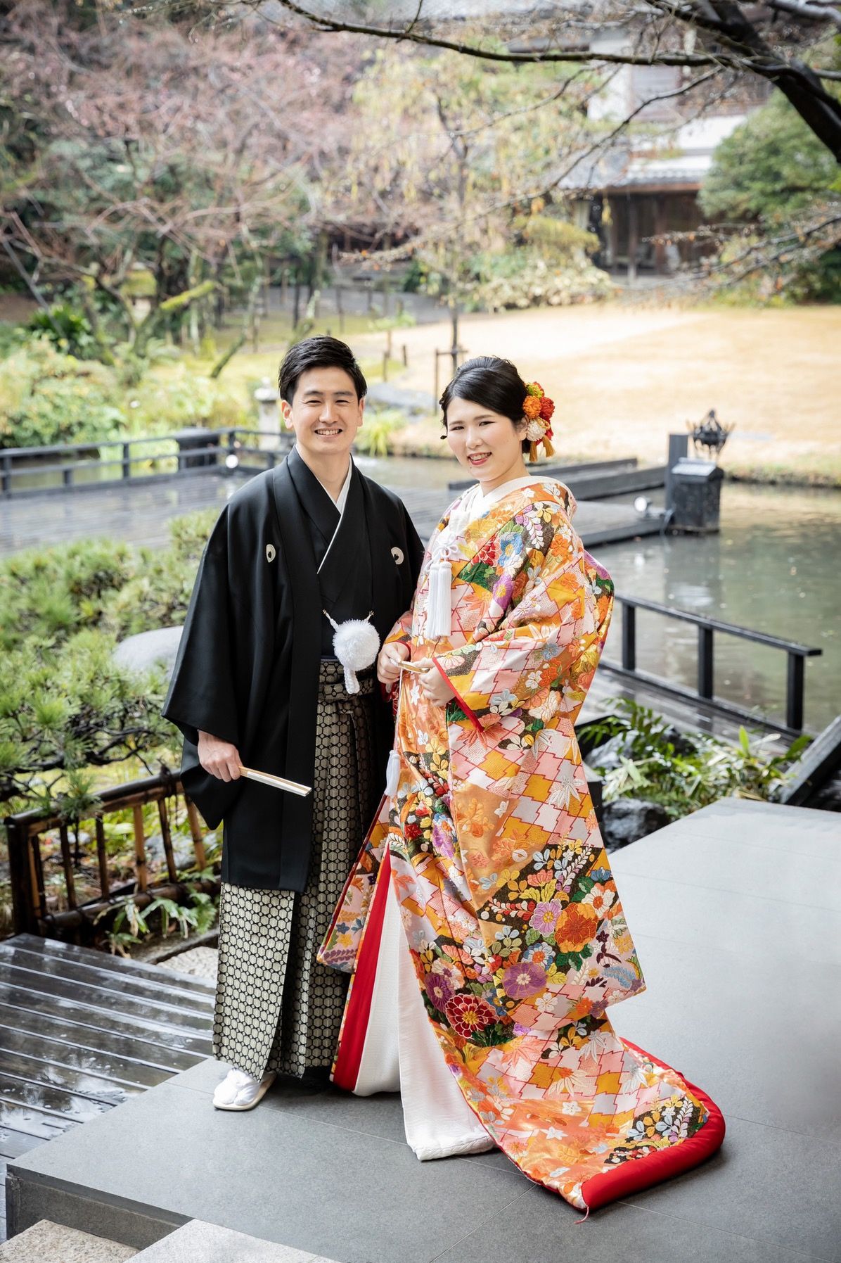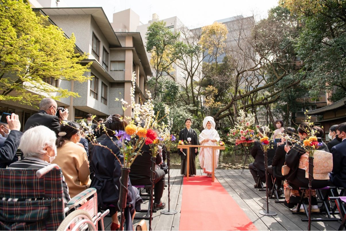 浮月楼は駅から近いのに静かな雰囲気の中、素敵なお庭の水上ステージで式ができます!ちょうど春だったので、桜が咲いている中素敵なお写真を残せました。