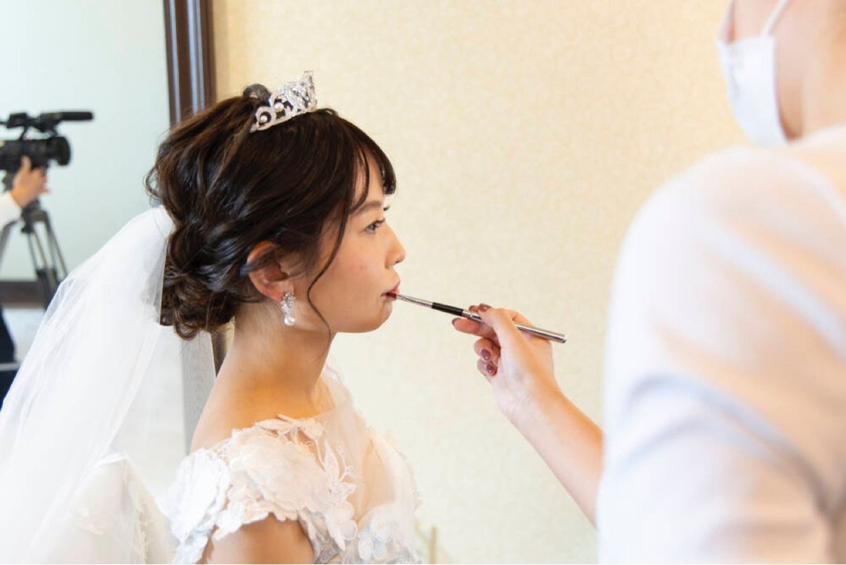 WDの時は柔らかい印象で、反対にCDの時は、少しクールな印象にしてもらいました。ヘアスタイルは、どちらもゆるふわですが、WDでは低めシニヨンの前髪あり、CDは高めポニーテールの前髪を上げるスタイルで、印象をガラッと変えています。