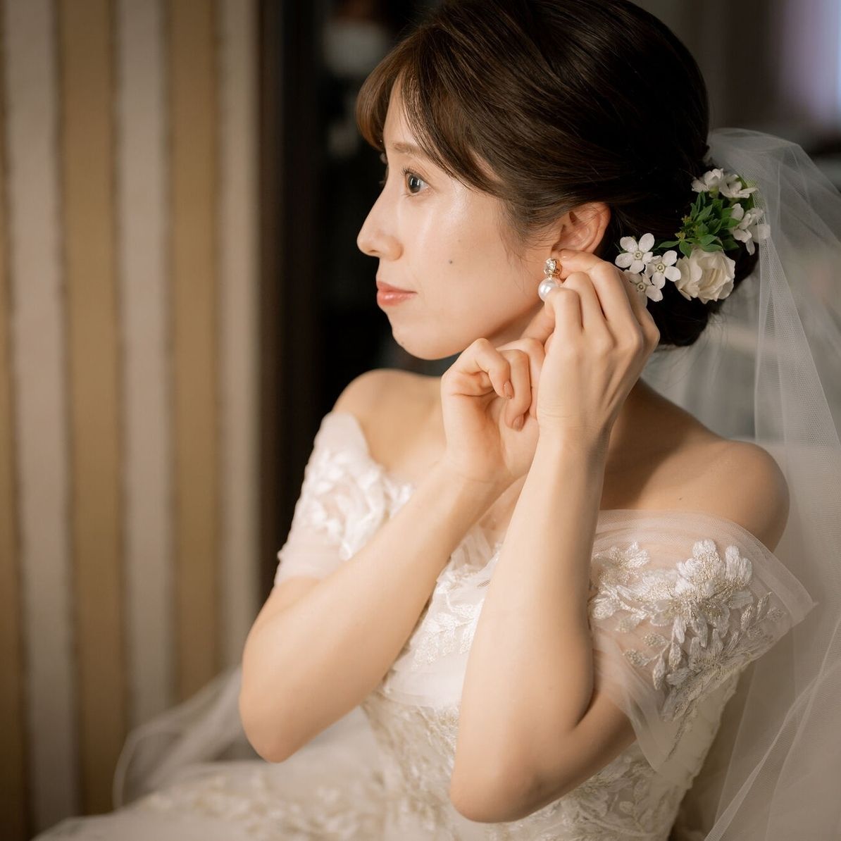 挙式:存在感のあるパールに惹かれElizabeth BowerのDuet Stud パールイヤリング・ゴールドにしました。
