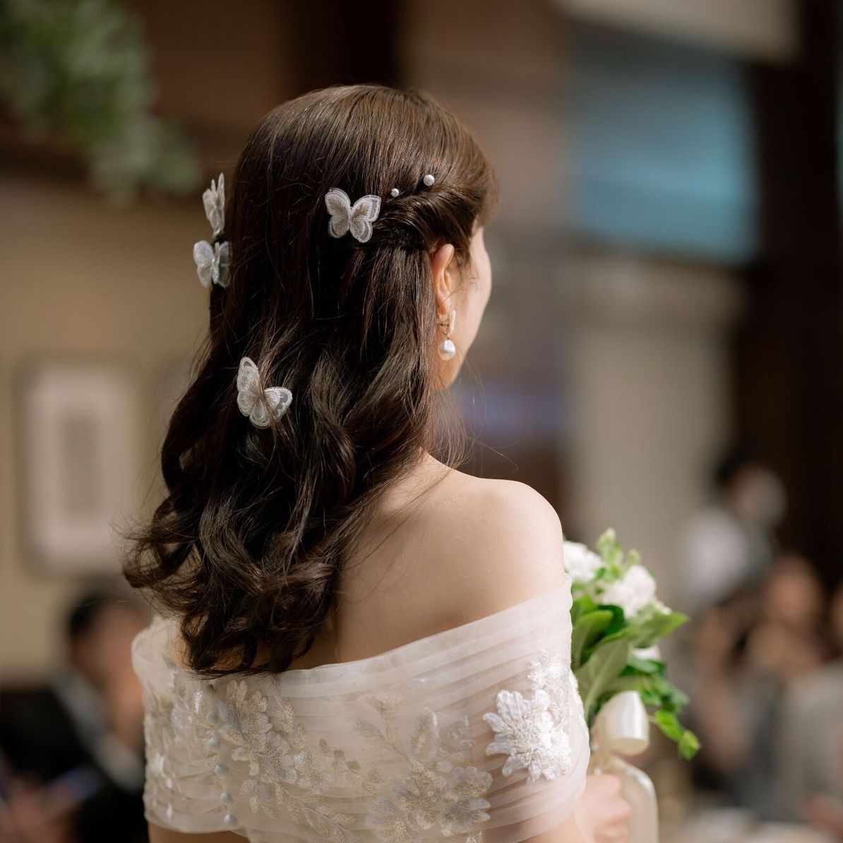 披露宴:ゴールドの刺繍入りの蝶々の飾りにしました。ドレスの雰囲気に合わせています。
