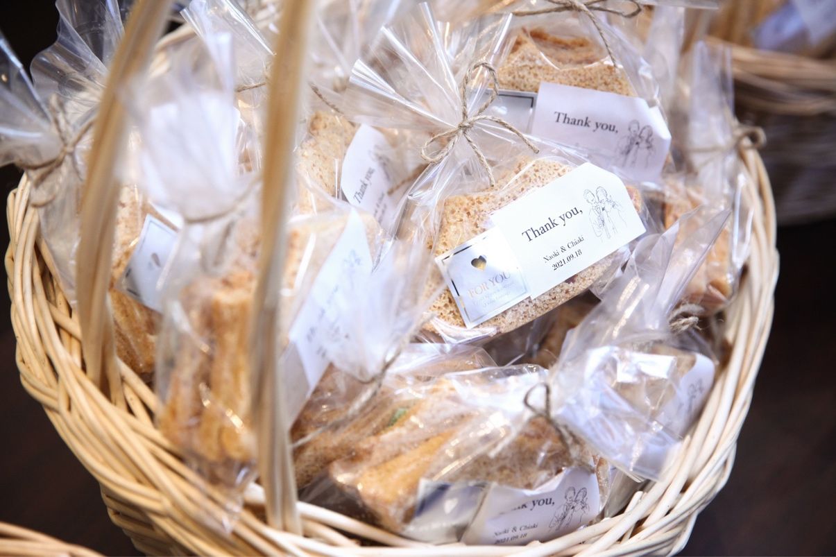 遠方や子連れのゲストが多かったので、引き出物宅配便を利用しました。緊急事態宣言下でなかなか旅行にも行けていないと思うので、全国のご当地グルメを集めた食べ物のみのカタログギフトを記念品にし、引き菓子、縁起物はそれぞれゲストごとに変えました。