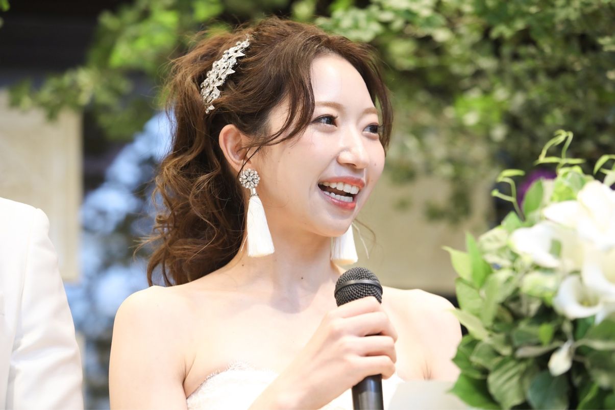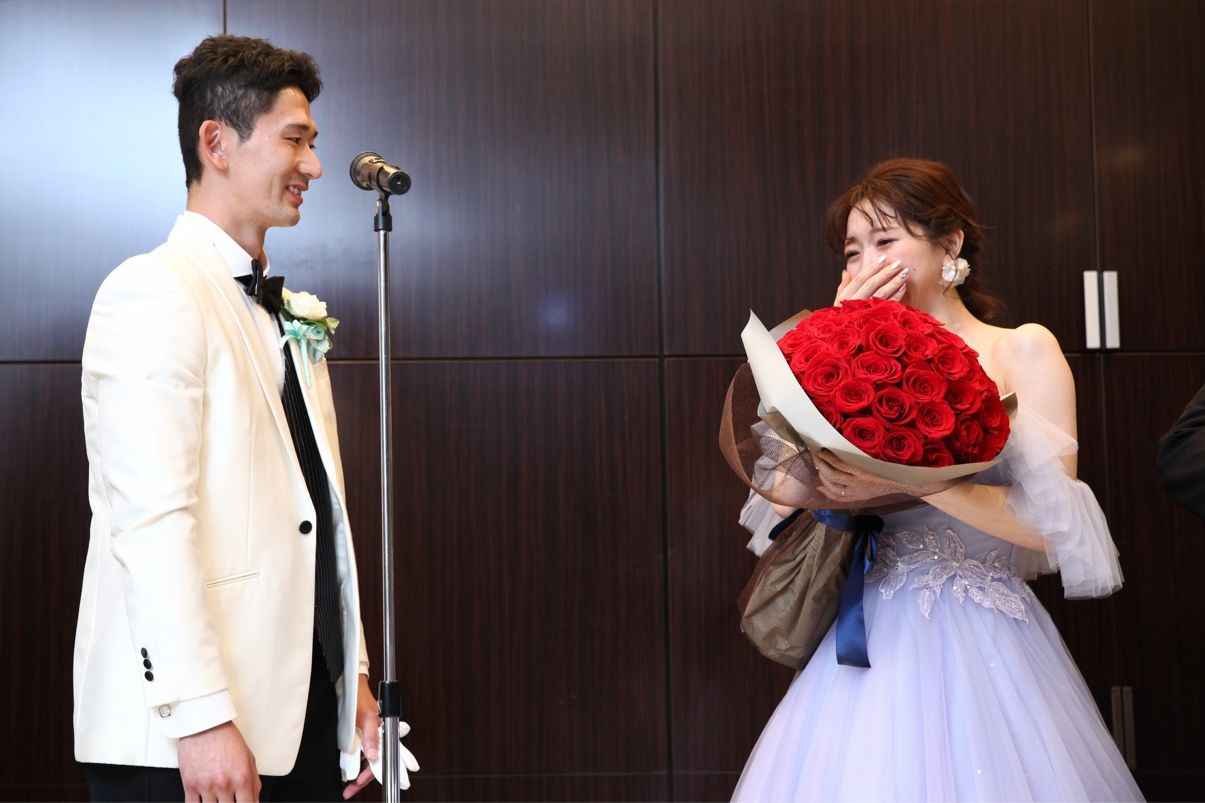 旦那が最後にサプライズで50本のバラの花束をくれた事です。本当に全く知らなかったので、本当に本当にびっくりしました!両親への手紙を読み終わり、謝辞が終わった涙腺が崩壊している時だったので、感動とびっくりで嗚咽しました(笑)