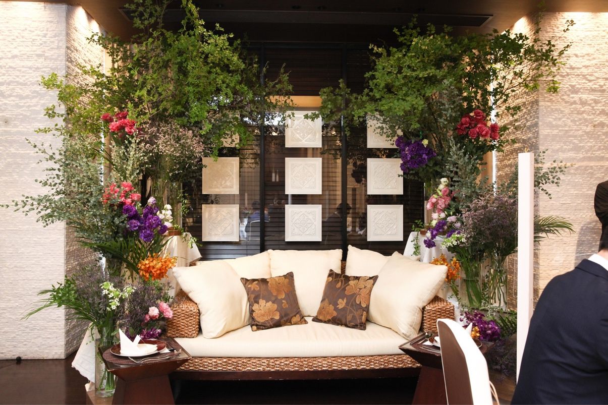 グリーンをベースにとにかくボリュームを出してもらいつつ、アジアンスイートの式場に合わせて鮮やかな色のお花をポイント使いしてもらいました。