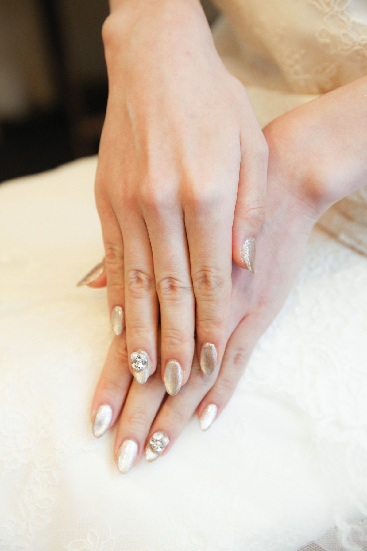 マグネットネイルのシャンパンゴールド(とシルバーの中間色)のワンカラーに、薬指だけVカットを乗せました。