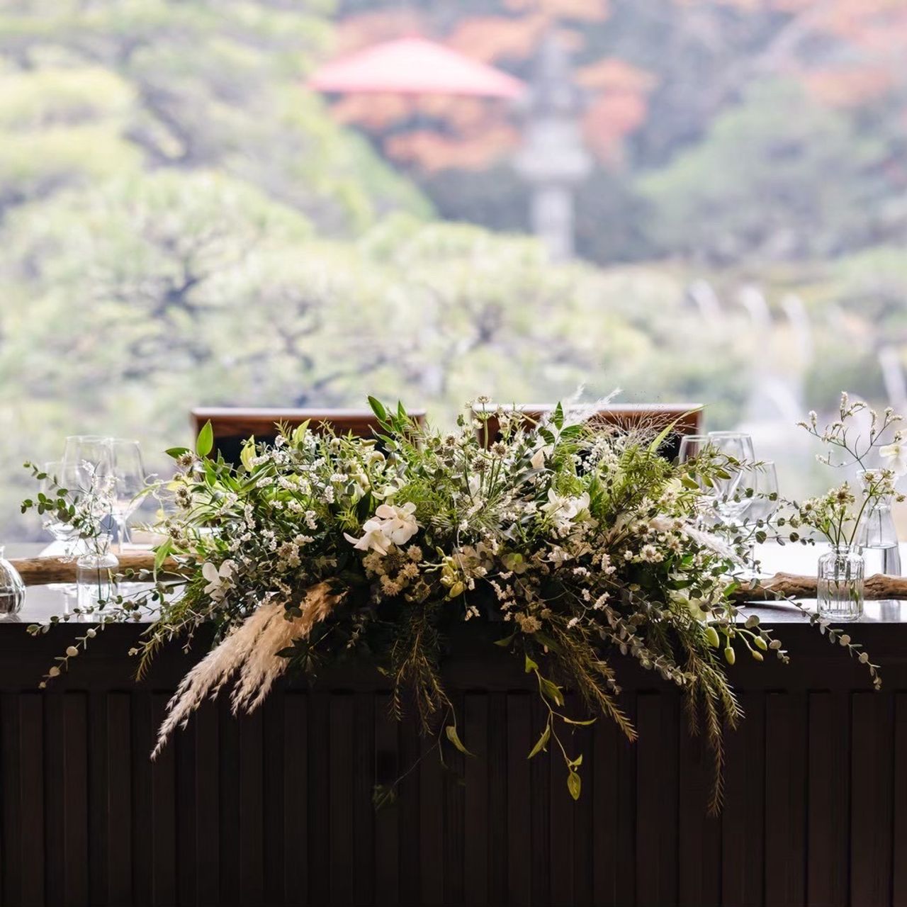 高砂の装花は、流木とパンパスグラスを使用したかったので、そこがこだわりポイントです。