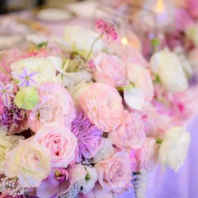 麝香のカーペットの色が薄紫をベースとしたお花柄のため、装花もカーペットの色に合わせるように、お花の種類にはこだわらずに薄紫、ピンク、白をベースにお願いしました。