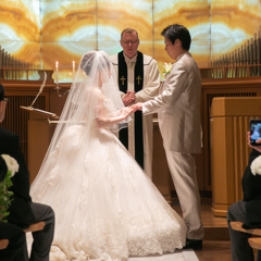イエローオニキスが使用されており、穏やかで温かみのある空間でした。また、パイプオルガンの音がよく響く天井の高い式場です。