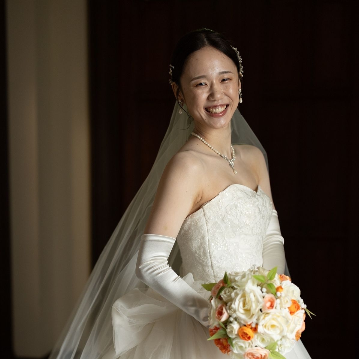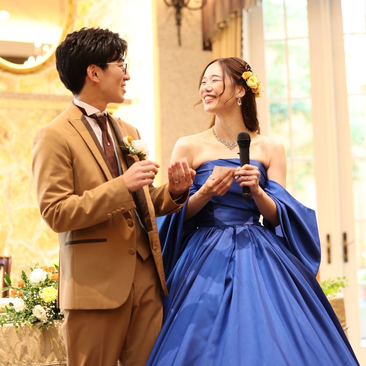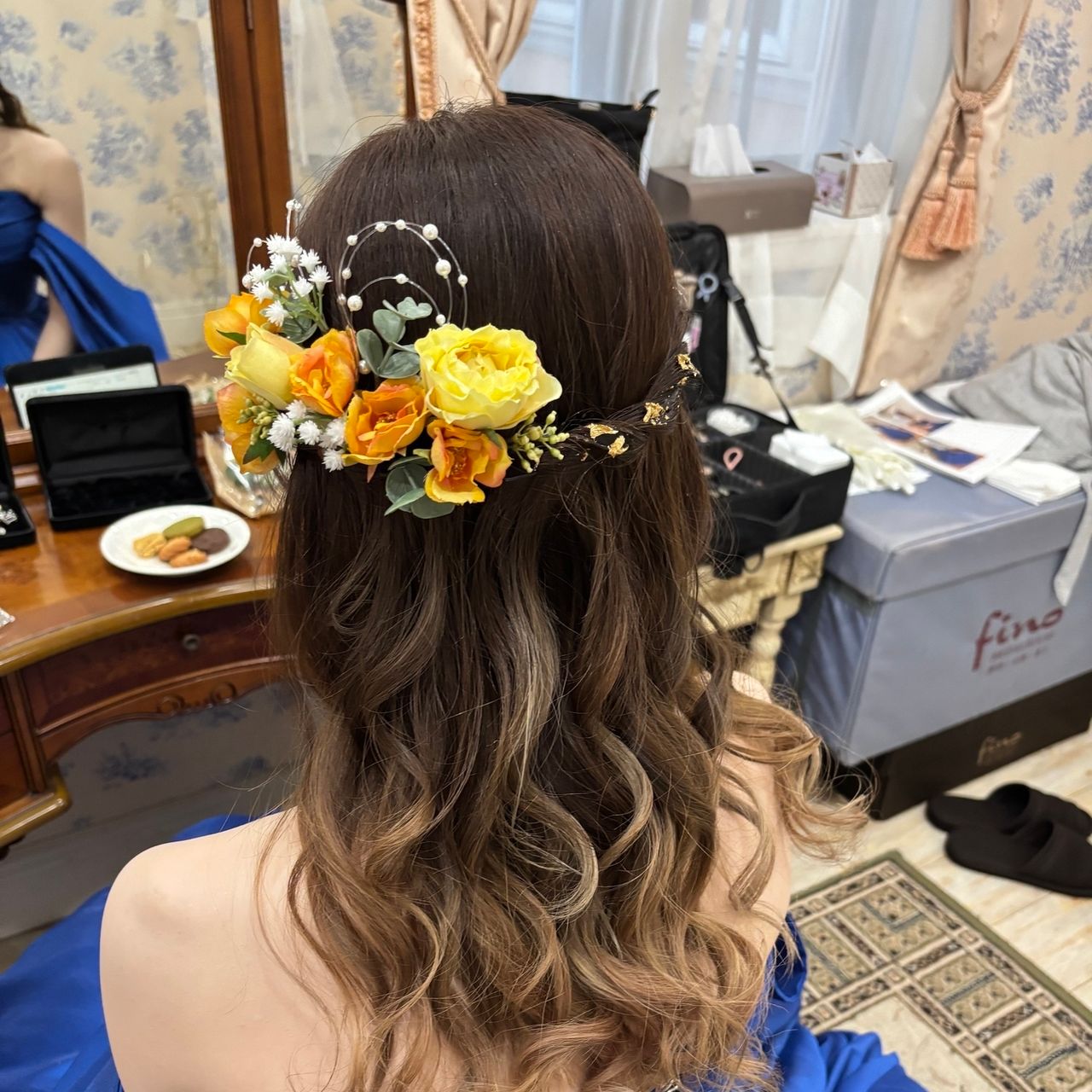 カラードレスの時は黄色とオレンジの花飾りをつけました!