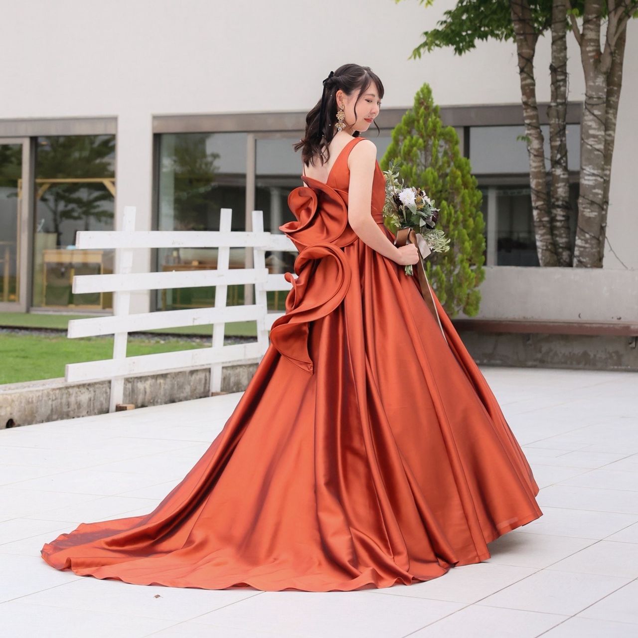 ずっと「テラコッタドレスを着たい」と思っていたため、衣装店に行った時に即決でした。後ろのデザインが、大きなお花のようになっているのがポイントです。