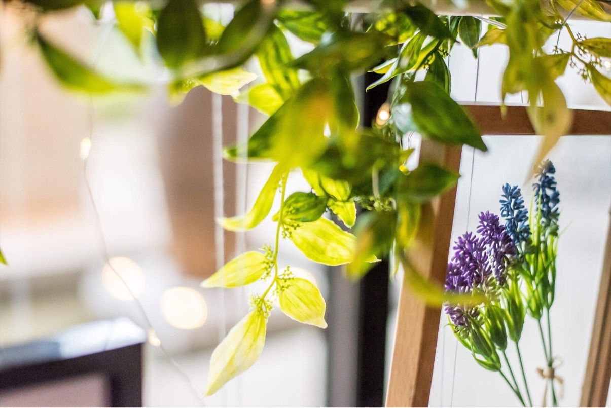 ・1.5次会のメイン装飾を、全て持ち込みで装飾したこと。 提携のフラワーショップにお願いすると高額だったため、ウェディングフラッグを自作したり、ドライフラワーを持ち込み、家にあるアイテムと組み合わせて飾り、節約しました。