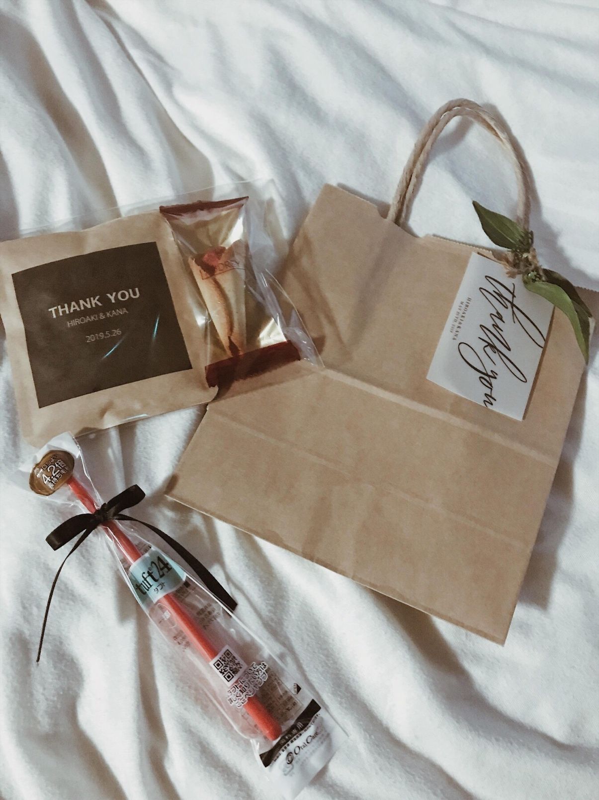 お互いの名前、パーティの日付の入ったオリジナルドリップコーヒーと、オードリーのグレイシア、私の職種が歯科関係なので、メッセージ入りの歯ブラシを贈りました。