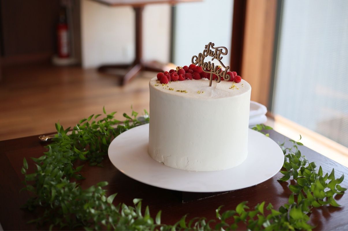 披露宴では、1段ケーキでクリームはマット仕上げで、トップの片側にクランベリーがのったシンプルなケーキにしました。