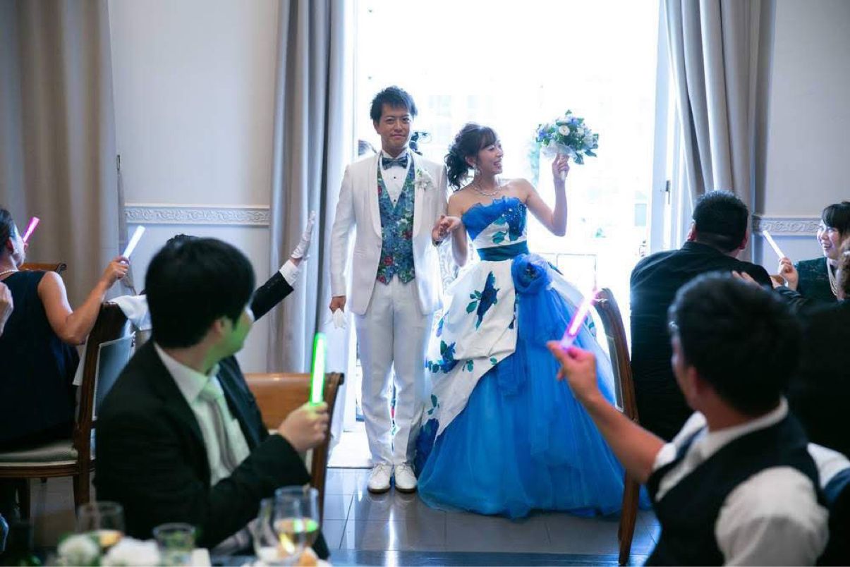 ・お色直しでは、カラードレス色当てクイズを行い、再入場の際にサイリウムを振ってもらいました。