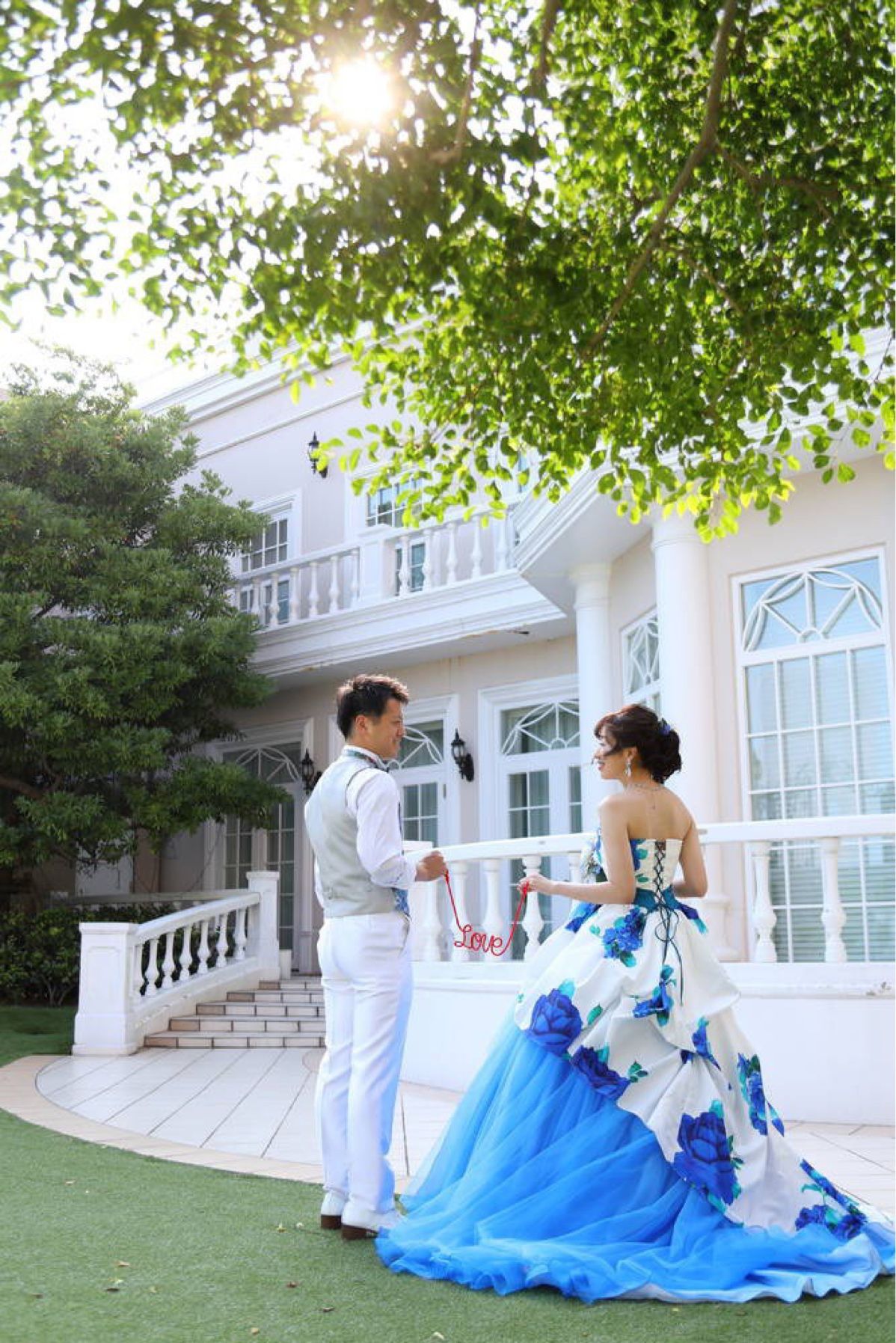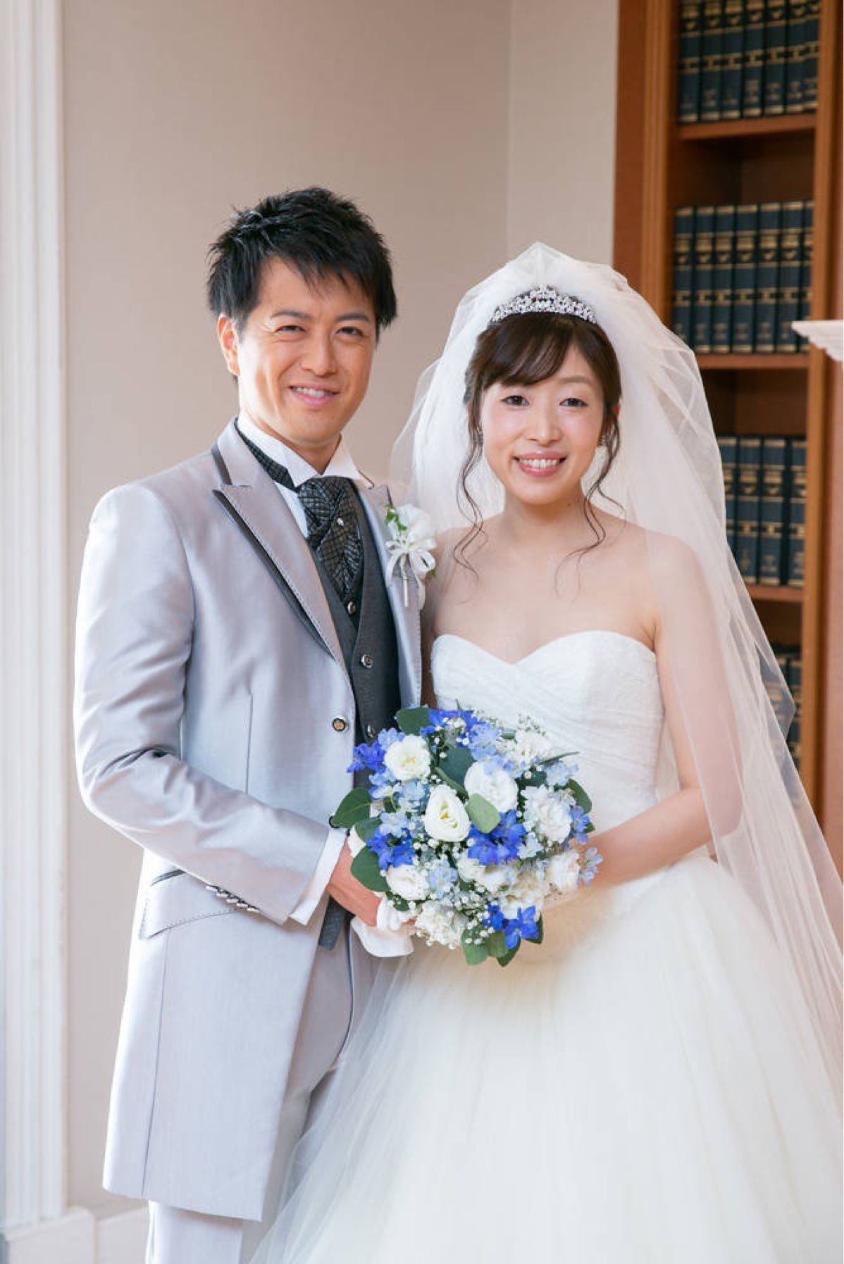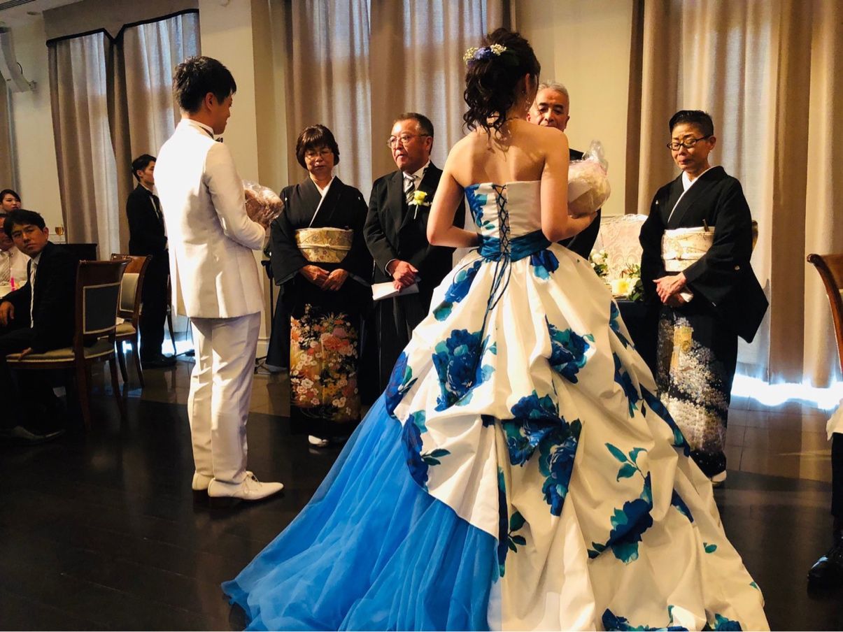 ・夫には、桂由美さんデザインの、ベストが同じような青系花柄のTXDを着てもらいました。夫婦で"青い花柄"をリンクさせたのが、ポイントです。