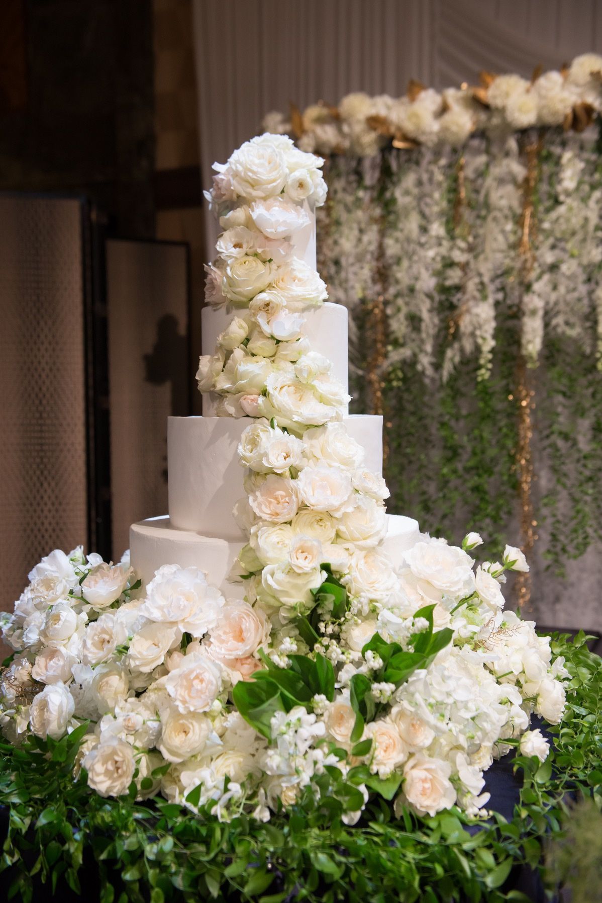 5段にしてもらい、上から白い薔薇が流れてるようなケーキにしてもらいました!また高砂の前面も緑メインの装花で埋め尽くしてもらっていたので、1番下の段にバラを敷き詰めてもらうことでお花畑みたいなケーキになりました♪