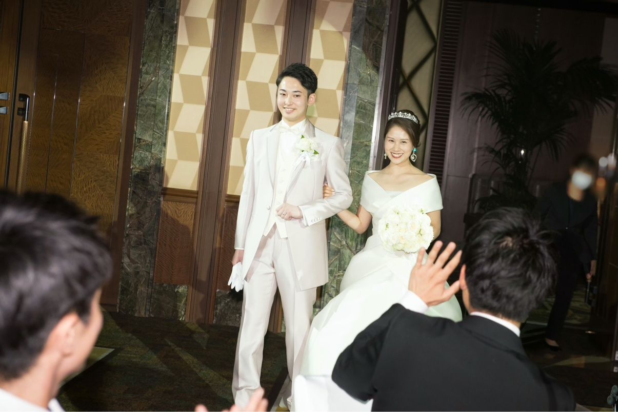 コロナ禍での開催ということもあり、不安でいっぱいのまま当日を迎えました。ゲストの顔を見るまで2人ともドキドキしていたので、披露宴のドアが開いて、たくさんのゲストの方が笑顔で迎えてくれた瞬間はとても感動しました!