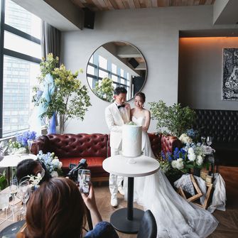 また披露宴開始前にはスクリーンにドローンの映像を流したり、会場装飾ではブルーを中心に装飾していただきました!