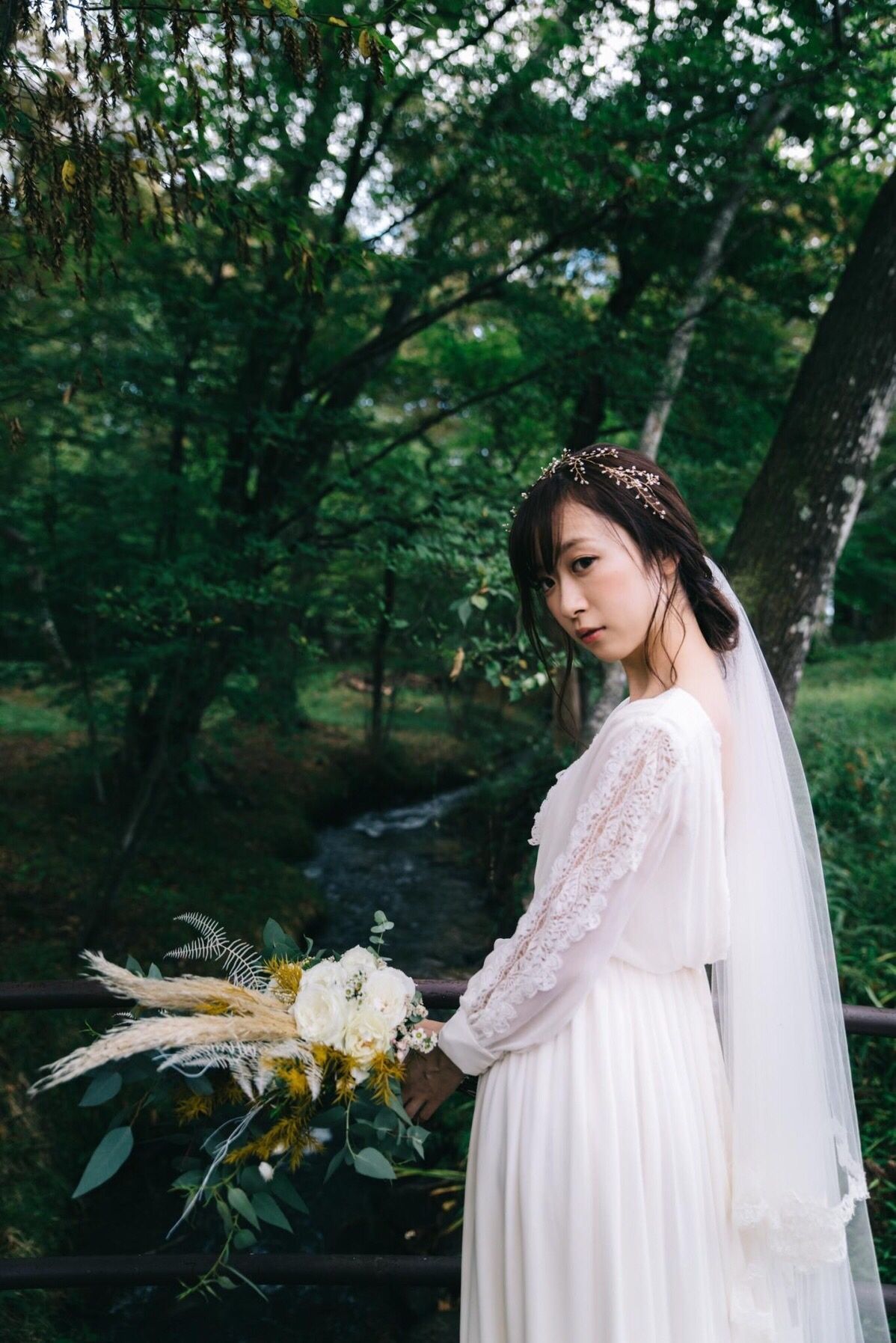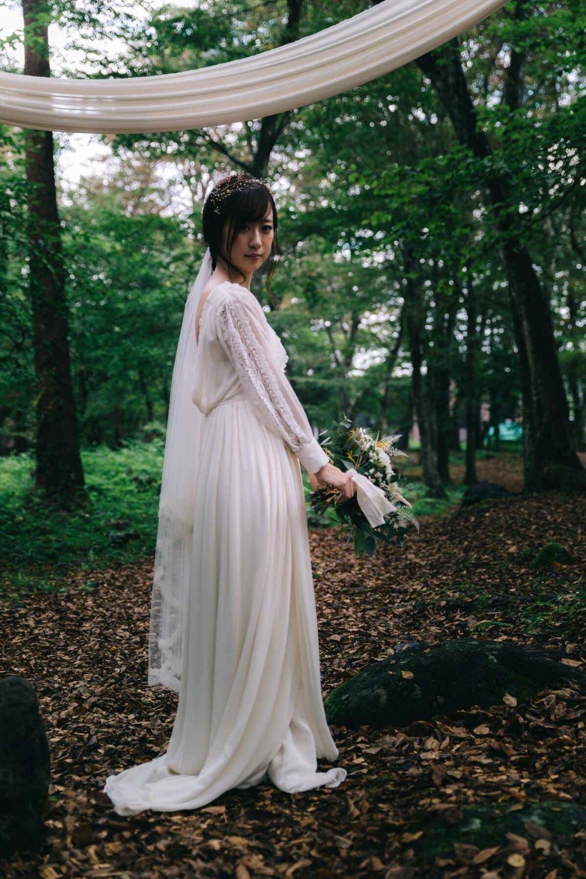 ガーデンウェディングのため季節的にも長袖でナチュラルに。母になった事もあり露出を抑え落ち着いた印象に。新郎との距離も近くが良かったので広がりすぎずガーデンになじむエンパイアラインで探しました。