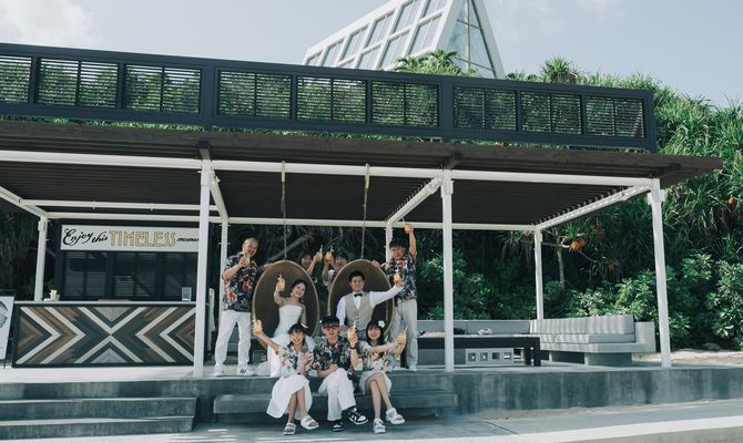 ブーケとブートニアをトロピカルな雰囲気にしたり、ビーチ撮影でサングラスをかけてみたり、家族にはかりゆしを用意したりして"リゾート感たっぷりに"を演出しています。