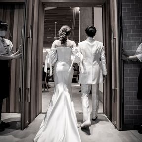 個性的かつシンプルでおしゃれなデザインと生地感に惹かれました。着るまでは挙式には少しデザイン性がありすぎるかなとも思いましたが、実際に着てみるとこれしか考えられなくなりました。笑