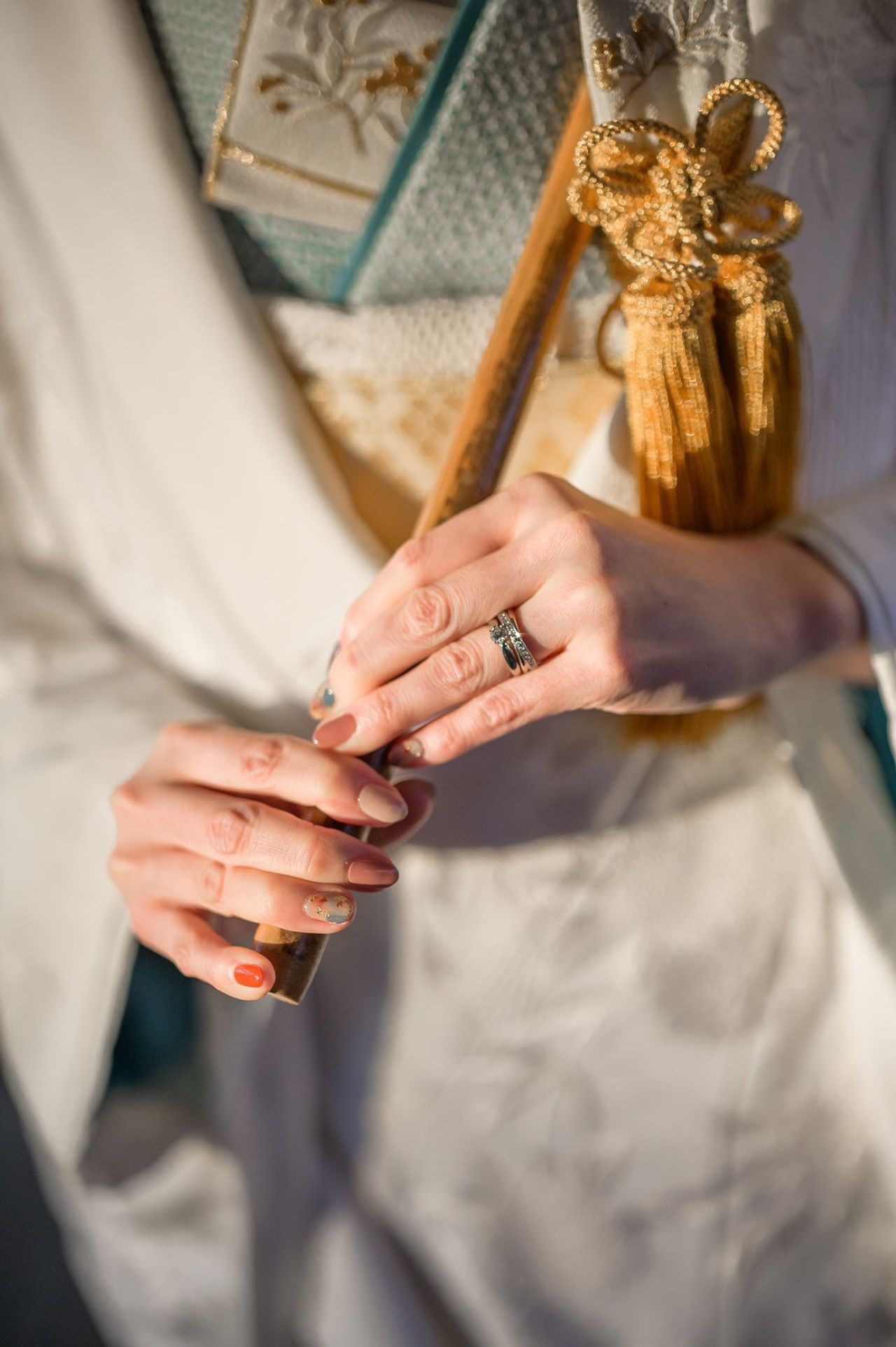ピンクベージュをベースとし、金箔でデザインをあしらったもの。あまり主張しない、ドレスや小物を邪魔しないようなデザインにしました。(ちなみに福岡⇄東京だったので時間に余裕なく、セルフで4日前くらいにジェルネイルをしました)