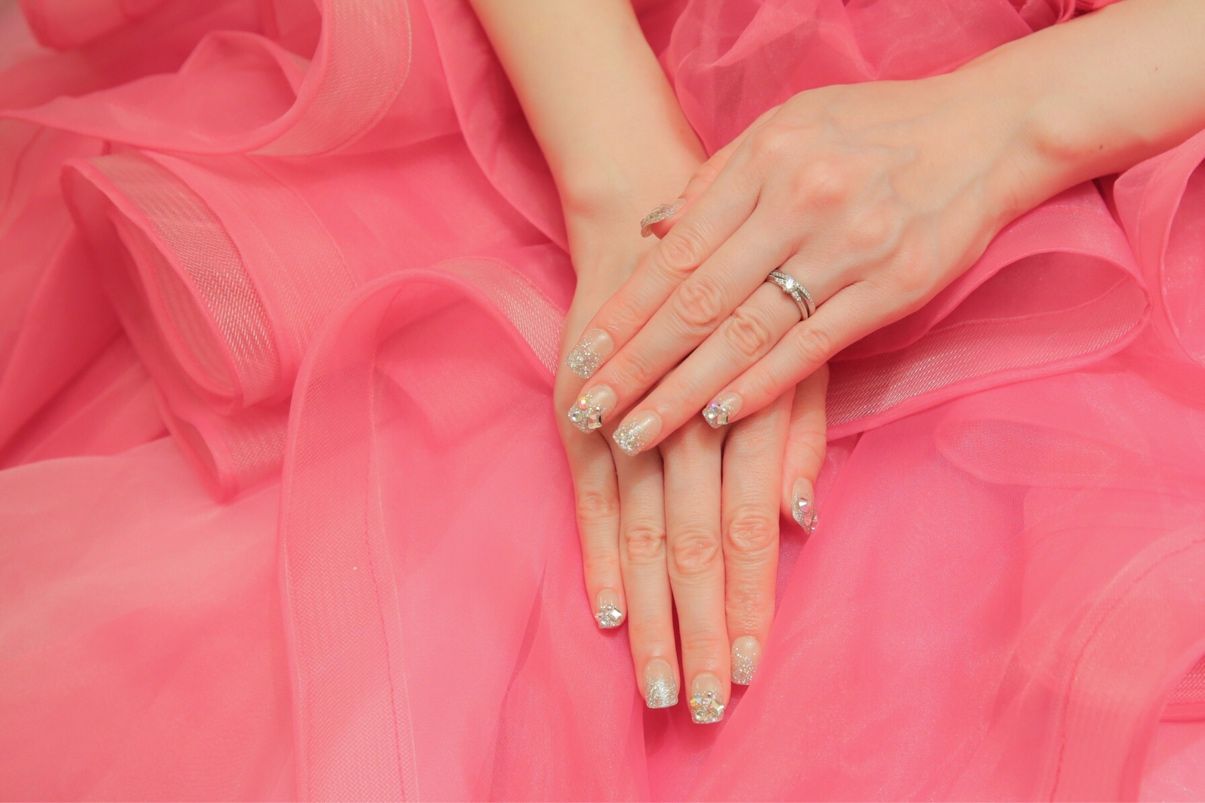 普段仕事上ネイルができないので、結婚式の日だけ楽しめるように、ネイルチップを購入しました。WDにもCDにも合うように、白ベースでキラキラのストーンがついているものにしました💅
