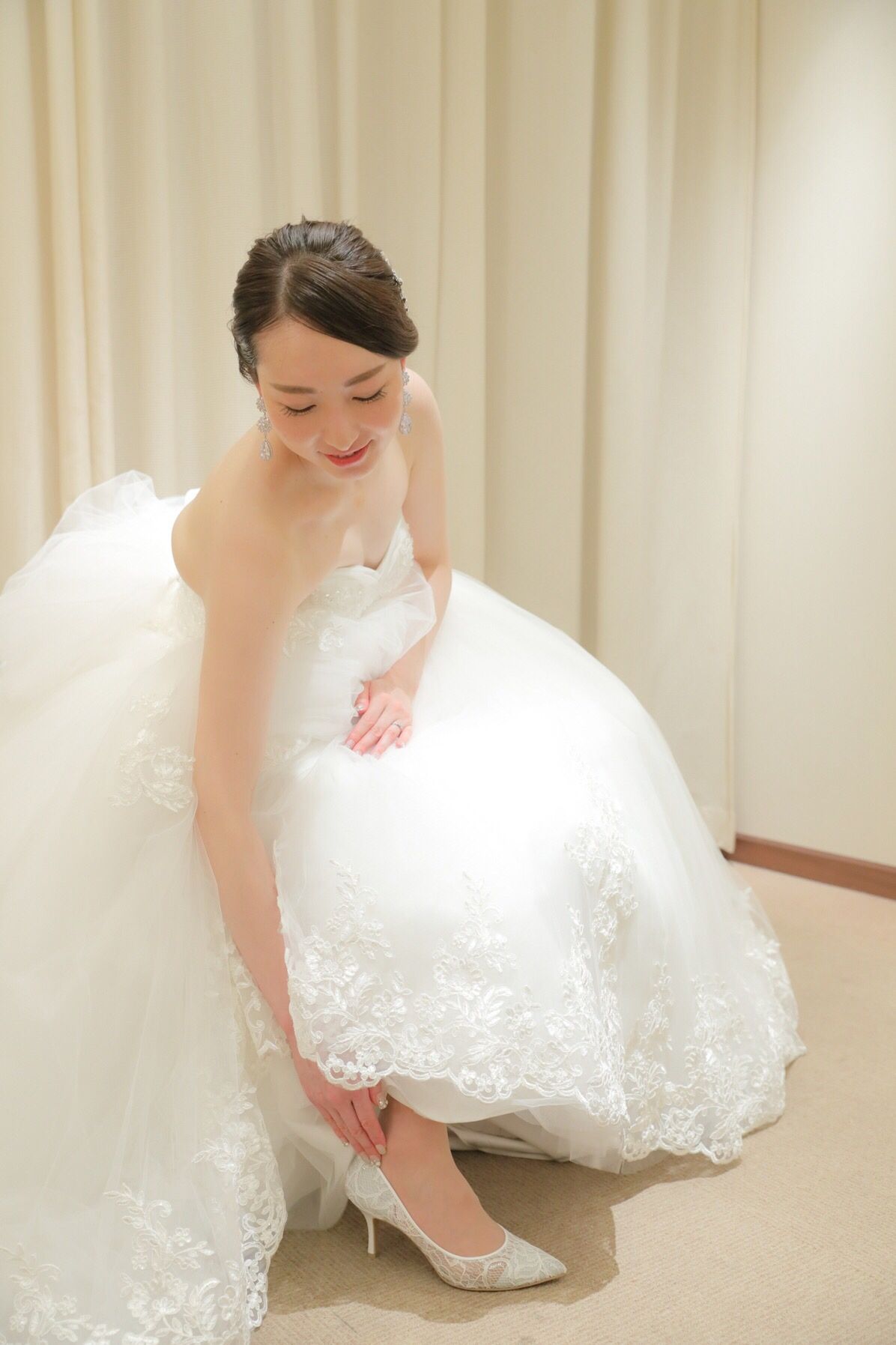 ドレスから見えることは少ないので、節約して安いノーマルなパンプスにしようかと思ったこともありましたが、結婚式が終わってからも特別な日に履けたらいいなと思い、このパンプスを選びました👠