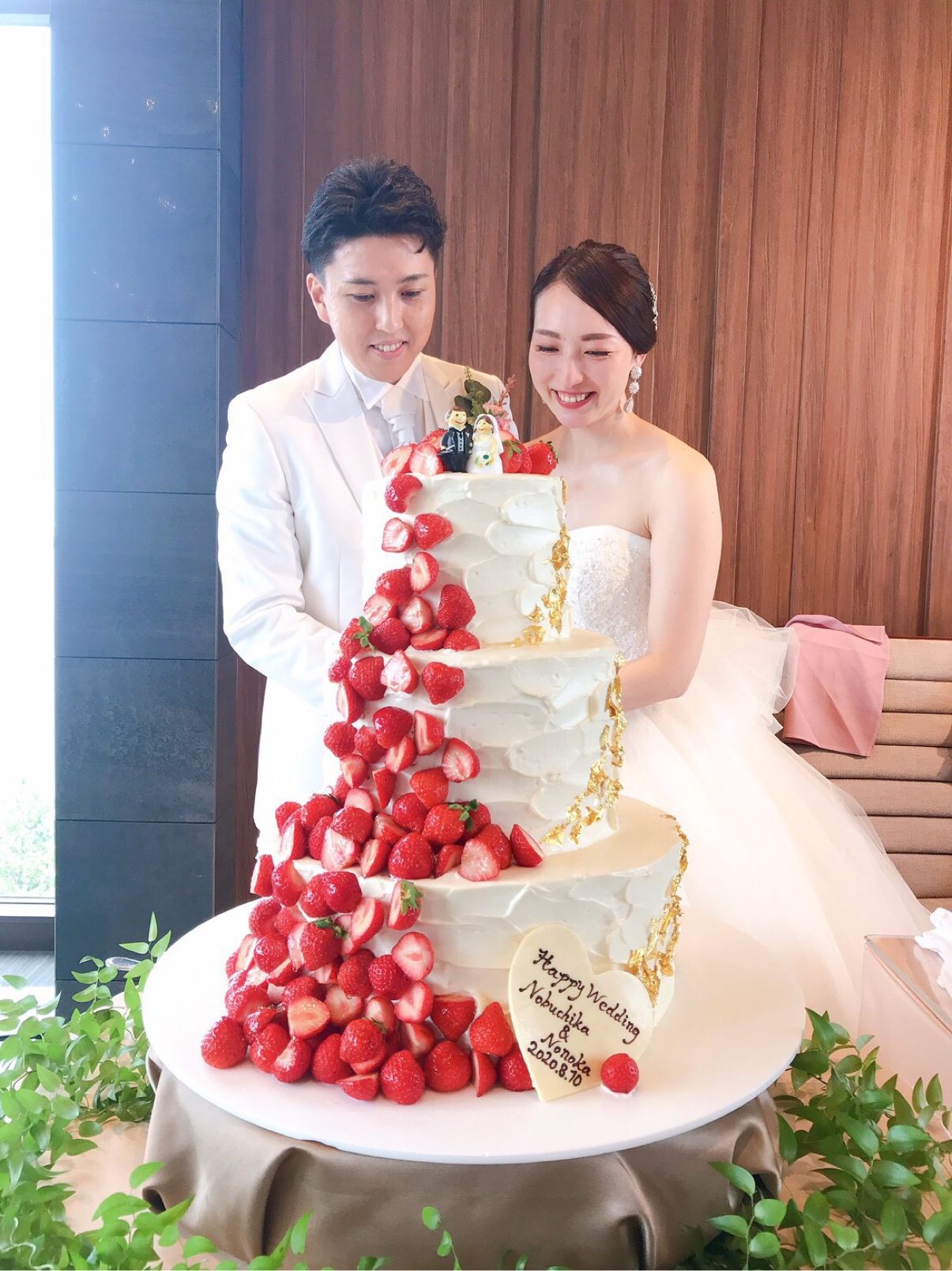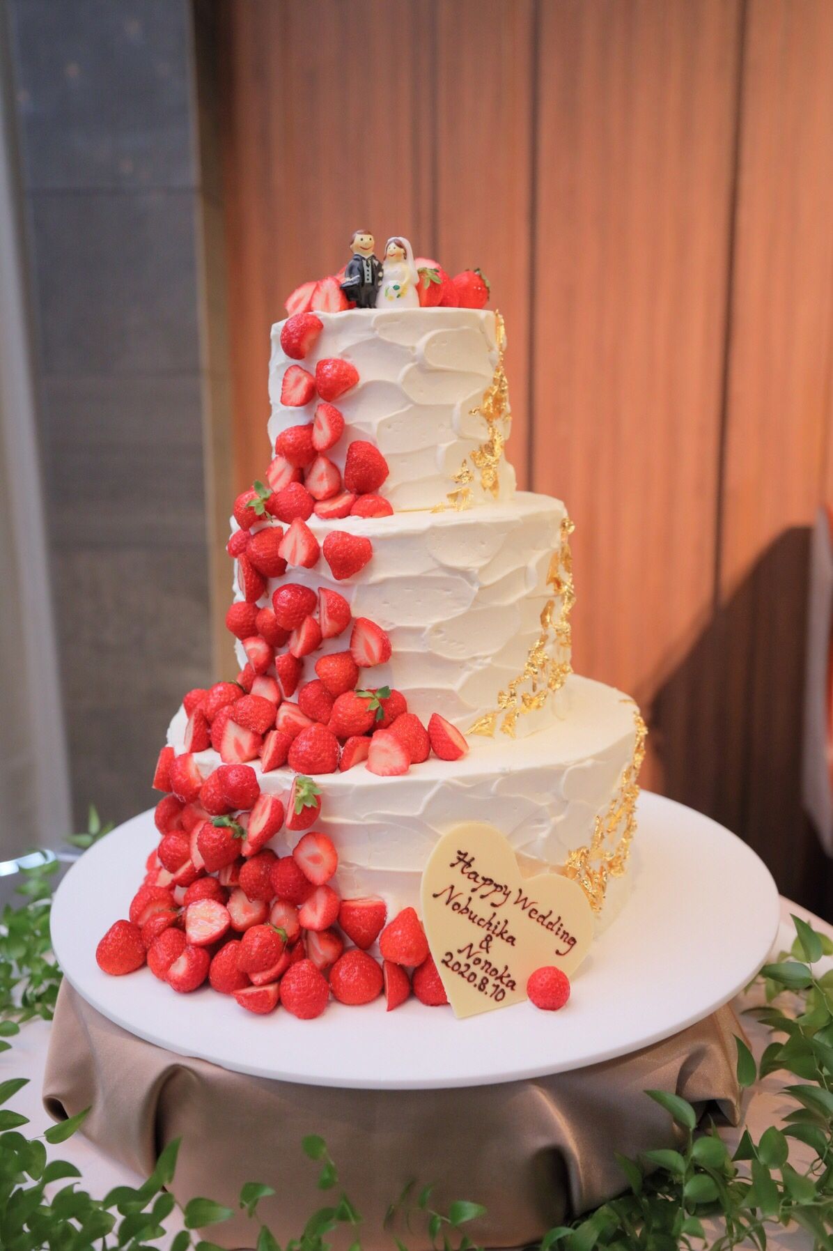高さも出したかったので、3段のケーキです🎂1番上には小さな新郎新婦の飾りを、下にはメッセージ入りのホワイトチョコレートを❤️金箔をつけてもらい、華やかさをプラスしました✨