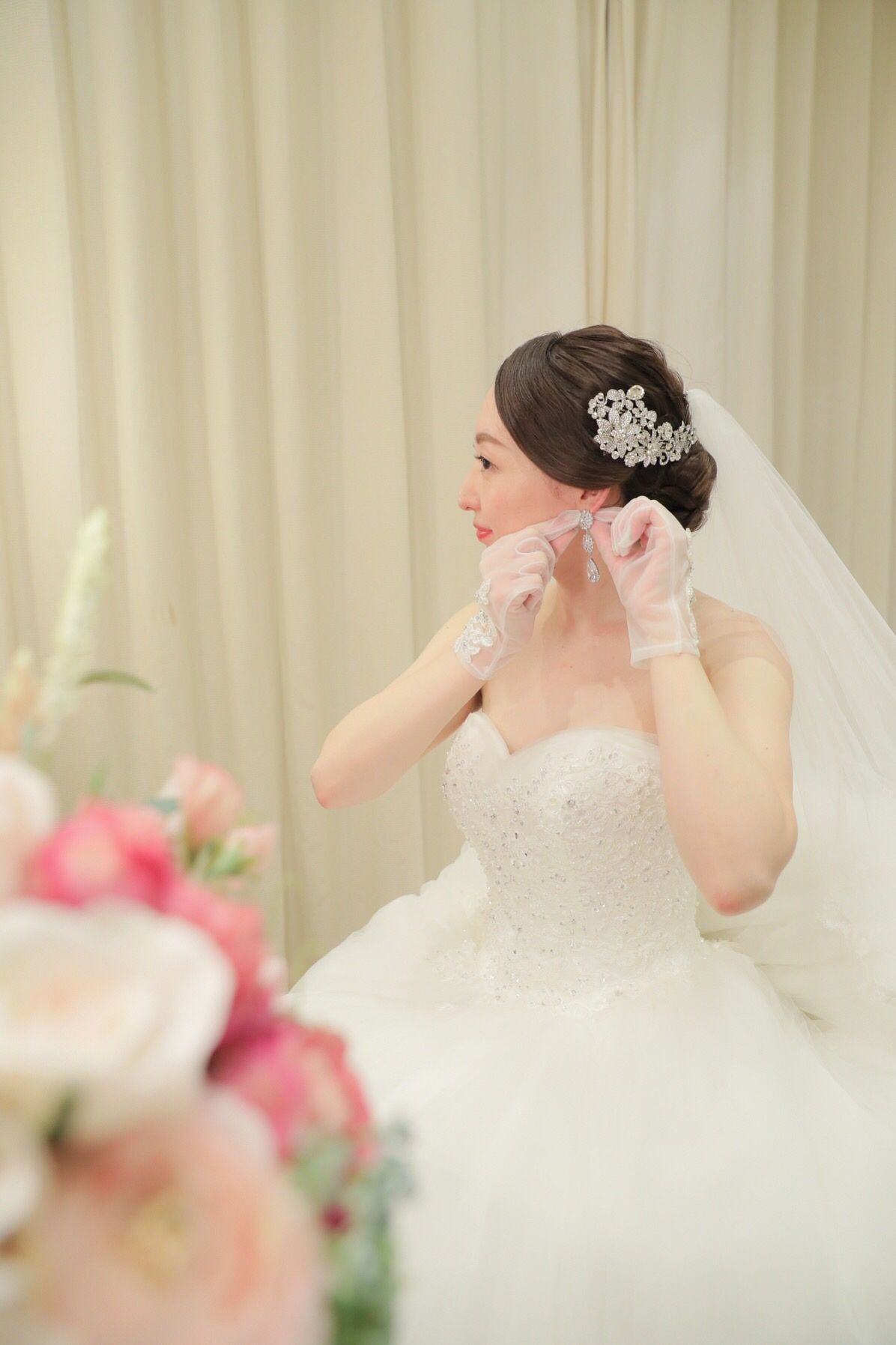 WDの時は、とにかくキラキラ光るものにしたいと思っていました。低めのアップスタイルにすることは決めていたので、家族友人からよく見えるよう、左側にヘッドアクセサリーをつけました。これもよく見るとお花の柄が施されています。