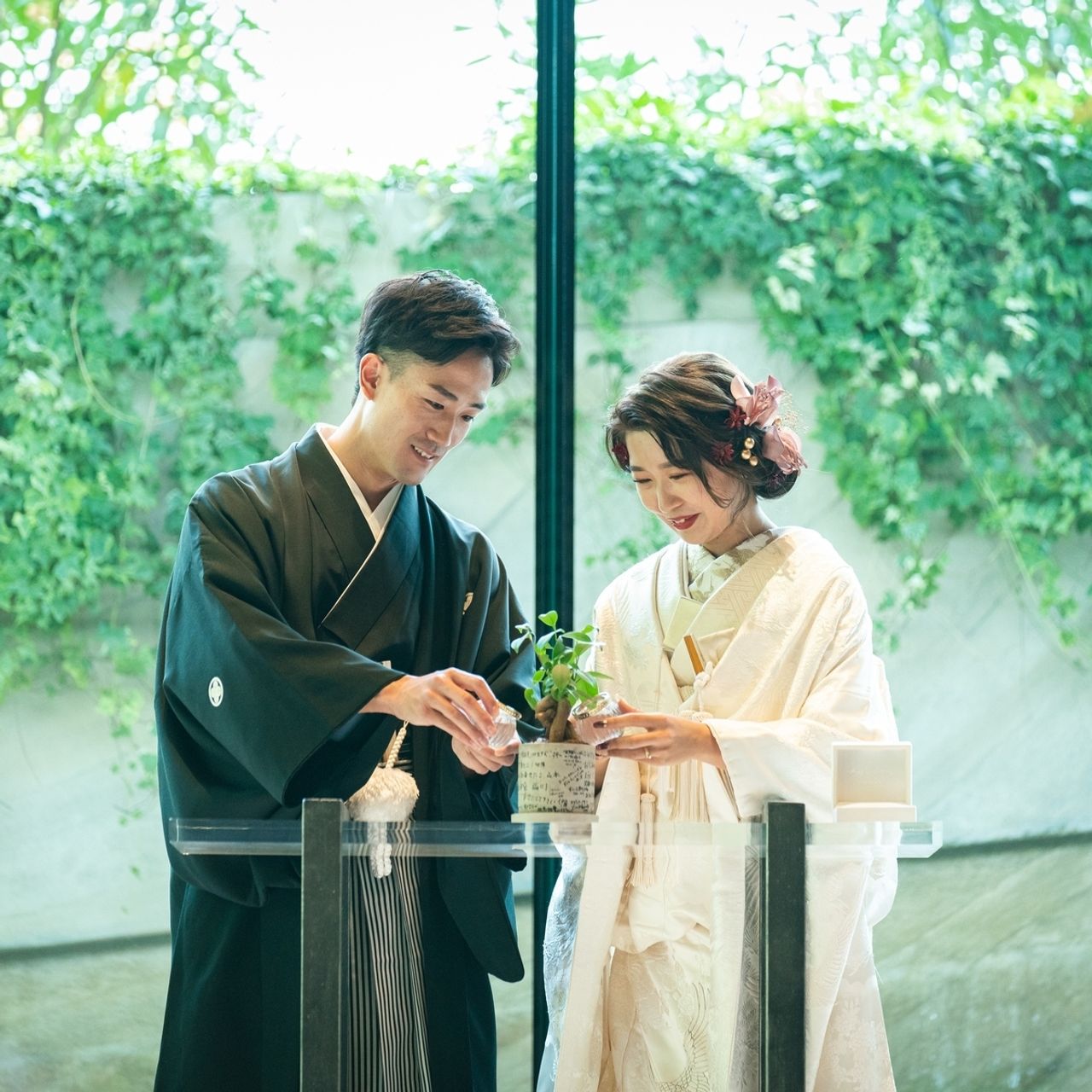 誓いの言葉を読み、指輪の交換をした後、結婚証明書記入のかわりに水合わせの儀を行い、両家の地である東北と九州の水をパキラに注ぎました。パキラの鉢には事前にゲストの待機場所でメッセージを書いていただきました。今でも大切に育てています。