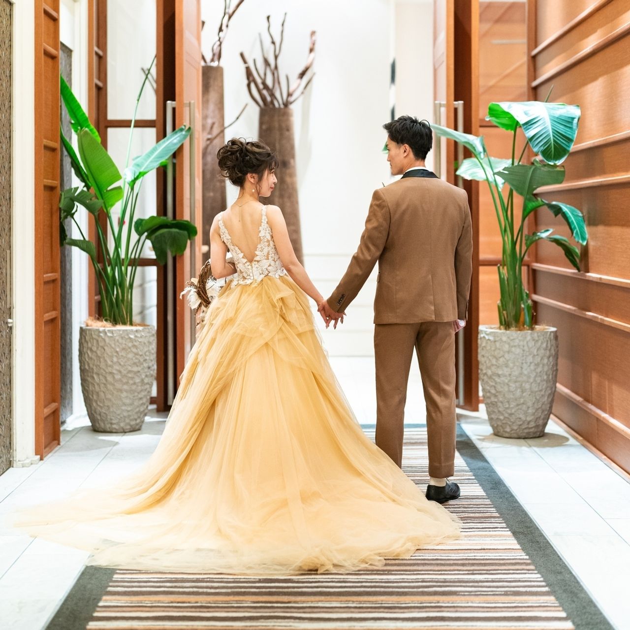 私たちが選んだ披露宴会場は、白壁でモロッコ調の彫刻があります。床はヘリンボーンで高級感もありつつ、どこかナチュラルな雰囲気にもなるバランスのとれたお洒落な会場でした。受付のアロマのいい香りとエレベーター周りの大理石がとても素敵なアクセントとなっています。また、自然と肌がワントーンUPする女性には嬉しい会場だと思いました。