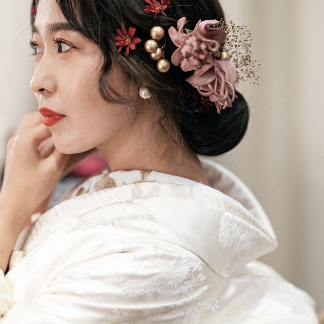 和装:髪飾りは手作りです!ブーケも手作りだったので、同じ花材を使用しました。