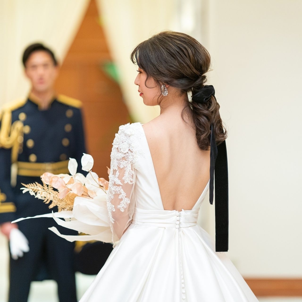 ウェディングドレス:紐の長いベロアリボンをつけています。髪の毛が思うほど伸びてくれなかったので、リボンで長さだしをしました♪ゆらゆらと揺れるリボンが写真1枚1枚違う表現をしているので、とてもお気に入りです◎