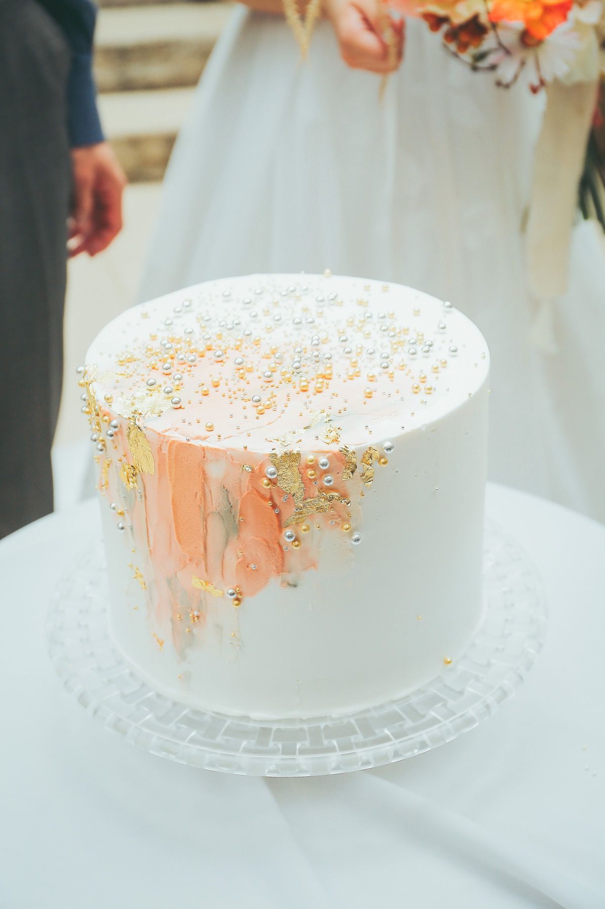 ウェディングキャンバス風に淡いピンクやテラコッタのクリームを塗ってもらいました。そして、金箔もつけてもらいました。最後に旦那さんとゴールドとシルバーのアラザンを振りかけて完成させました。キラキラしてて本当に可愛かったです♡