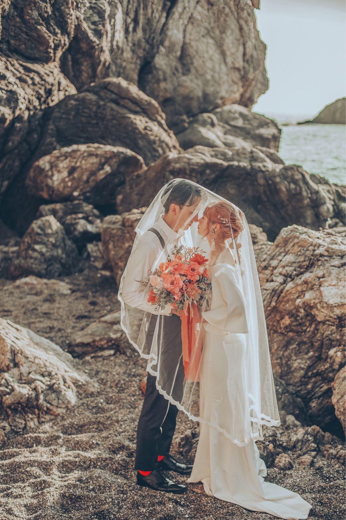私たちは2人らしさを表現したかったので人前式を選び、証明の証としてウェディングキャンバスを行いました。結婚式のテーマカラーでもあるテラコッタは、ブーケ、旦那さんの靴下、ネイルなどたくさん取り入れています。チャペルのブルーと相性が良くて、どの写真を見返してもとっても可愛かったです♡
