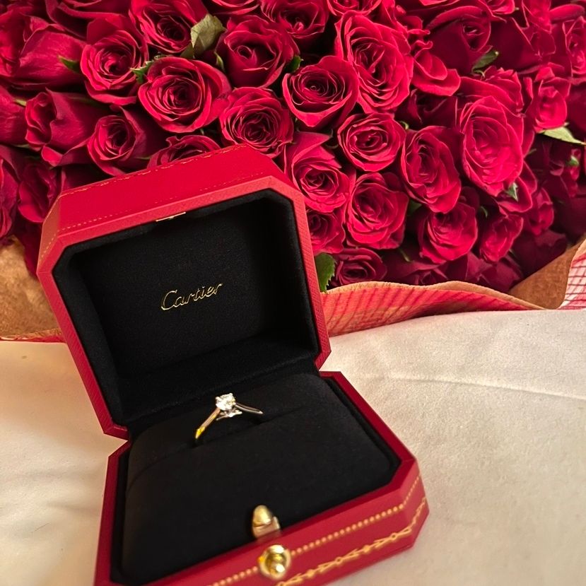 プロポーズのときに主人が友人たちに相談しながら準備をしてくれて、108本のバラの花束とこの指輪でサプライズをしてくれました。