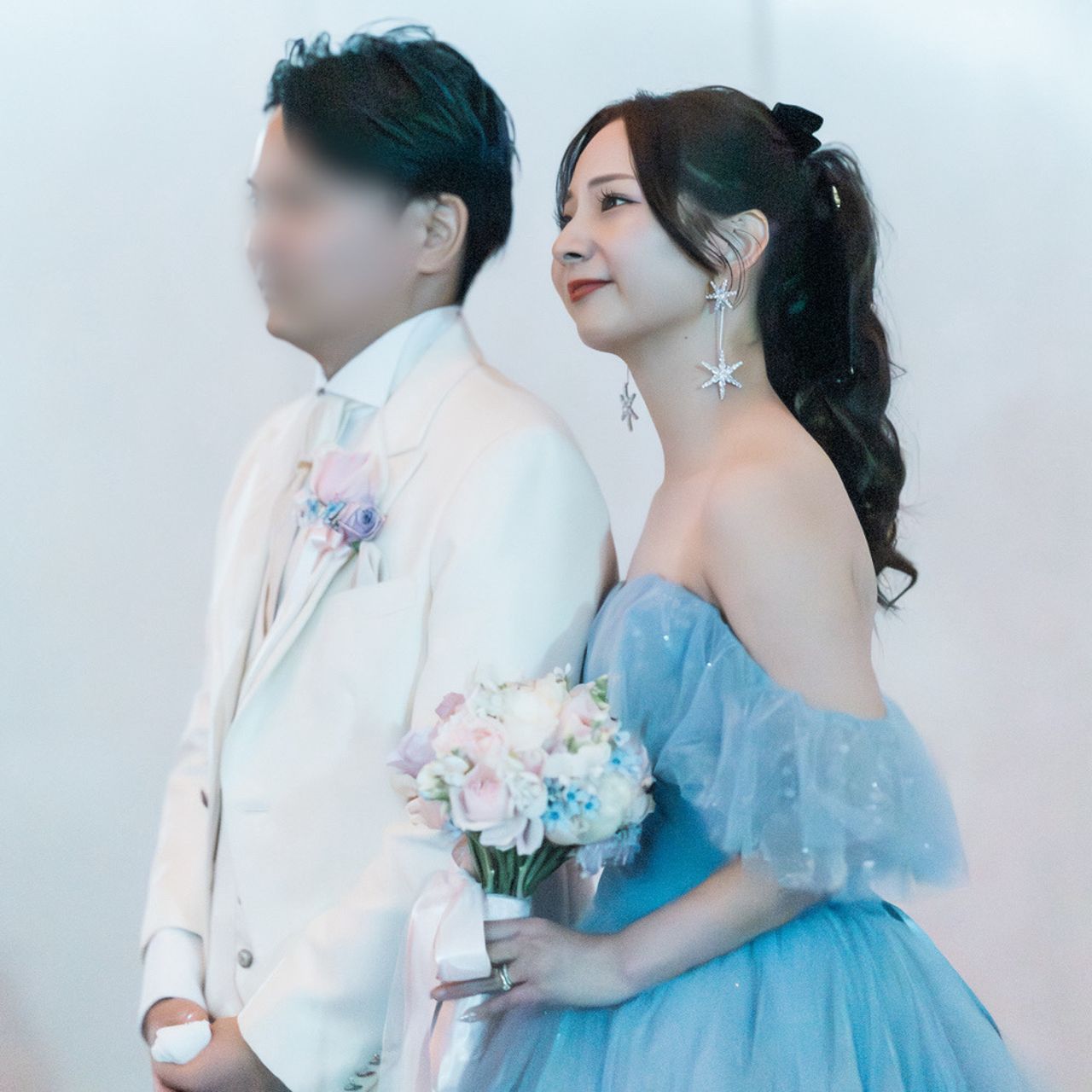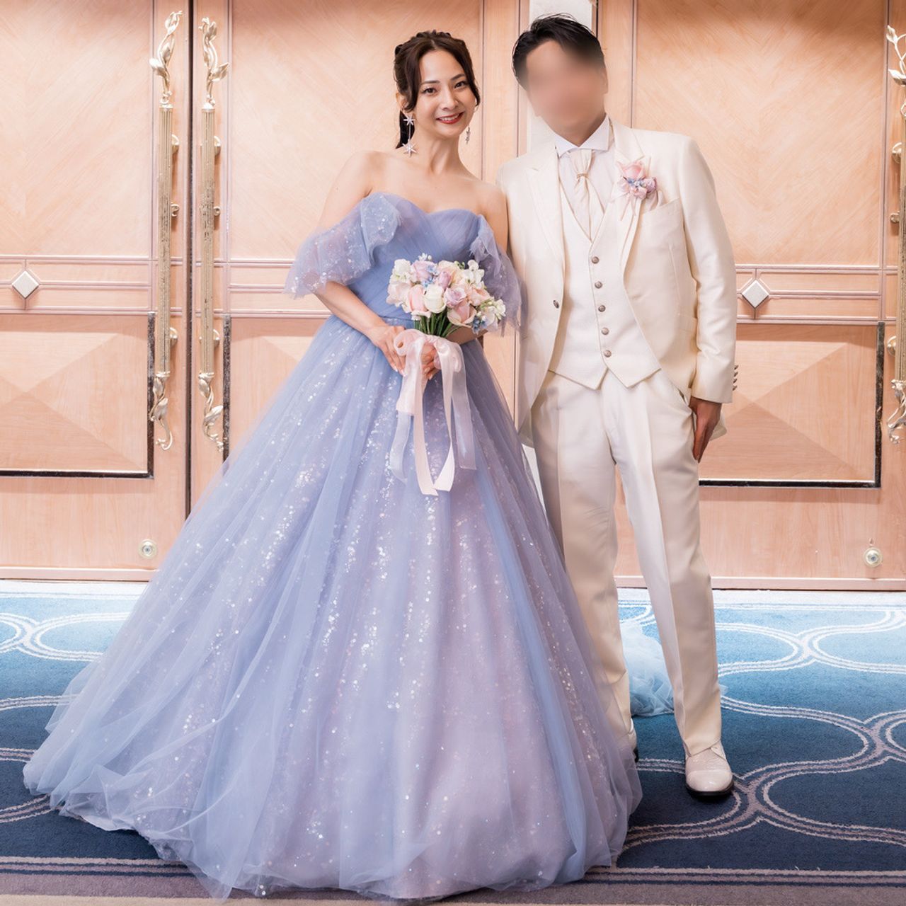 絶妙なブルーが肌を綺麗に見せてくれて、スパンコールの輝きも上品で華やかです。