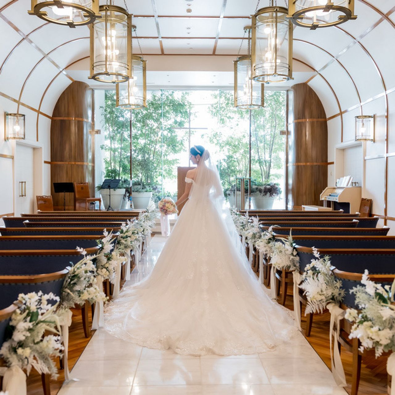 豪華客船を思わせる非日常の空間に、みなとみらいの絶景と自然光が広がるチャペルです。