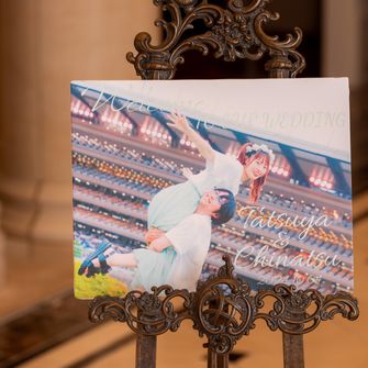 お互いの趣味である「競馬」をコンセプトにしました。席札は馬券をモチーフに作成して、ウェディングケーキは競馬のコースをモチーフにしました。また、プロフィールブックも競馬に因んだデザインにするため表紙の写真を東京競馬場で撮影しました。ハートコート横浜に決めたきっかけは外観も内装も理想以上だった事、ゆるキャラを呼んだり歌う事が出来たりする演出の自由度の高さ、オリジナルカクテルを作れるところに惹かれました。