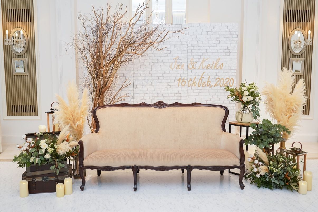 高砂にもゲストのテーブルにもパンパスグラスを使ってもらえて、一気にオシャレな雰囲気になって嬉しかったです。高砂はイメージ画像をお見せして、想像以上にかわいくしてもらえました。ツリーにLEDライトをつけてもらってキラキラで、新郎新婦の名前が書かれたレンガ風のボードもかわいくて大満足です。