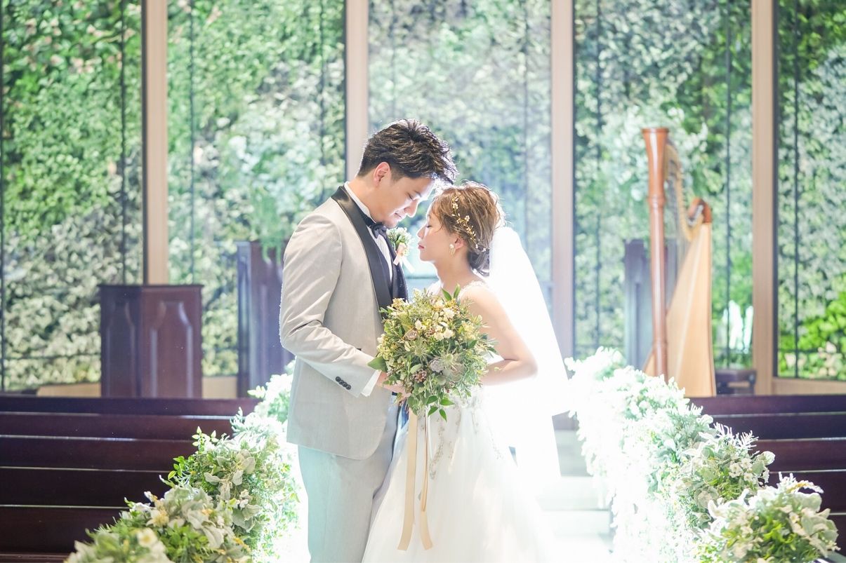 グリーンに囲まれたチャペルで、装花をプラスしなくてもじゅうぶん華やかです!サックスやハープの生演奏もしてもらえて、オシャレな雰囲気になります◎
