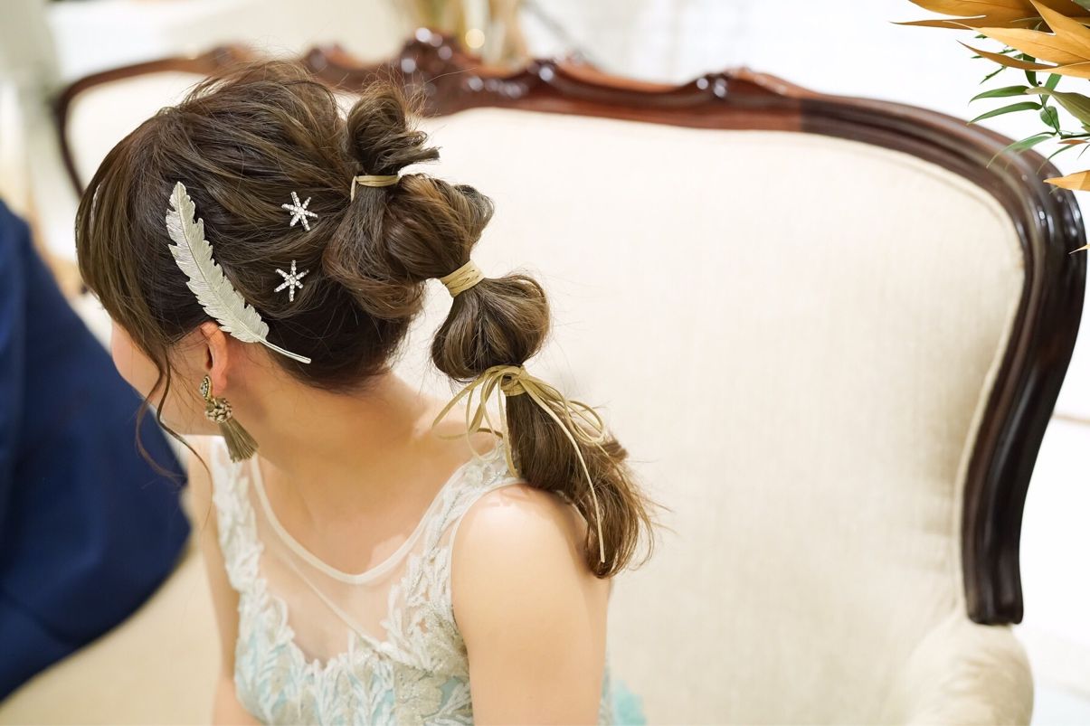 髪型は1着目はおでこを出してウェーブのシニヨン。2着目は前髪をおろして、高めのポニーテールで紐アレンジでたまねぎヘアにどちらもイメージ画像を見せてイメージに近づけてもらえて大満足でした!