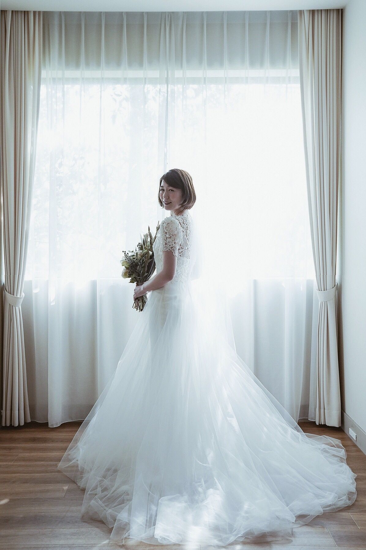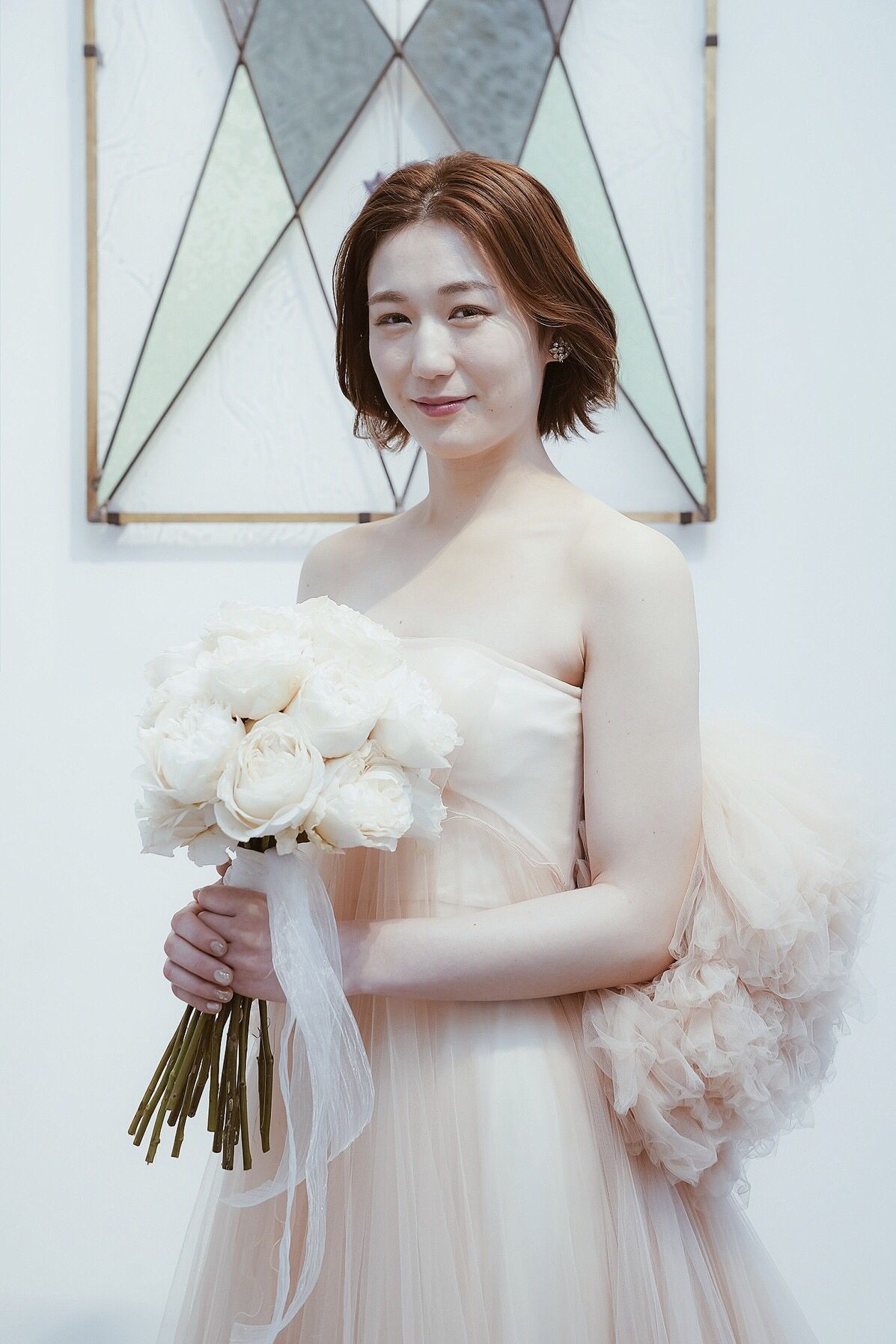 気取らないカジュアルさをテーマにしていたので、ドレスで着飾る分、ヘアーは普段と変わらない自分らしい感じにしたく、髪が短いのでボブのまま前髪だけアレンジをしてもらいました。