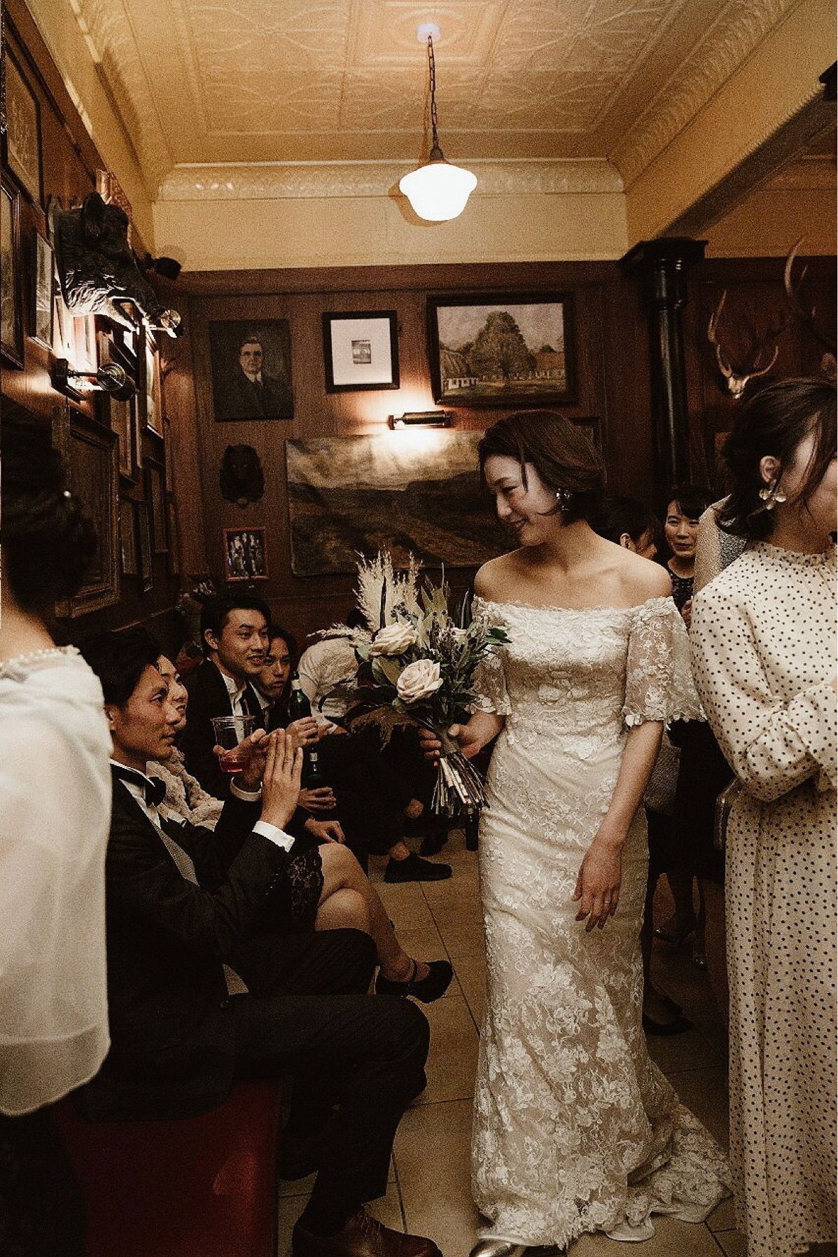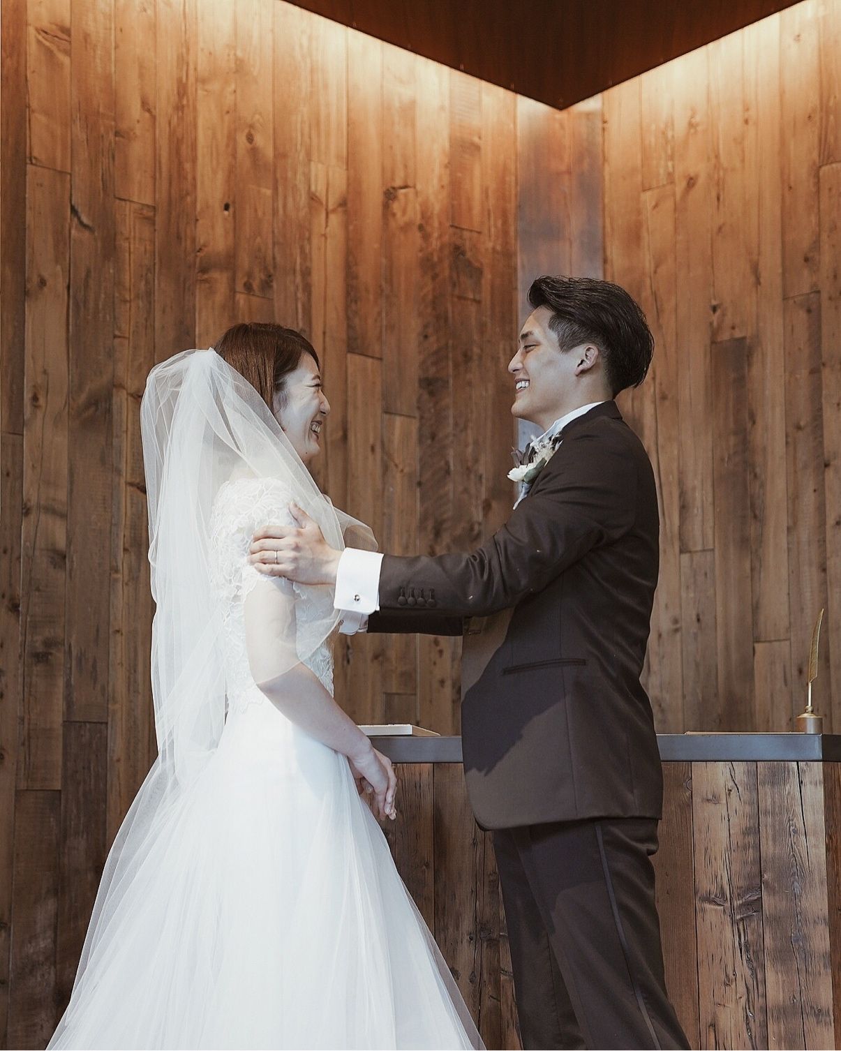 完成した花束を新郎から受け取り、新婦がお返事として1輪を抜き、ブートニアとして胸に挿し、これで誓いが完成しました!という演出にしました。