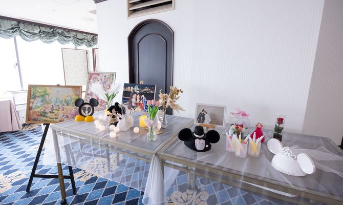 ウェルカムスペースにはミッキーとミニーのぬいぐるみを置いたり、ペーパーアイテム系は全てディズニーをモチーフにして作成していただいています。